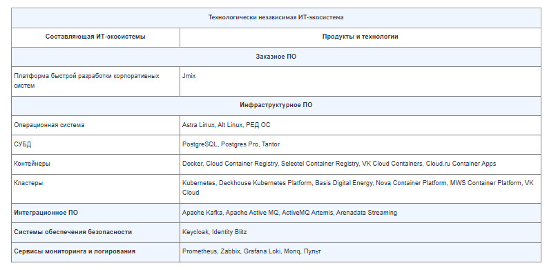 В задачи этой статьи не входит детальное описание функциональности и особенностей каждого из решений, которое может использоваться в технологически независимой ИТ-экосистеме. Также не было цели привести сравнение продуктов или максимально полный список доступного ПО. Материал представляет собой верхнеуровневый обзор, призванный на основе нашего опыта широкими мазками очертить контуры ИТ-ландшафта, сформировать чек-лист и обозначить направления для более глубокого изучения. Для достижения технологической независимости важно, чтобы исходный код решения был передан заказчику, причем с возможностью сборки и изменения без участия вендора. Во многом это зависит от платформы, на базе которой разработана система. В частности, для Low-Code платформ возможны ограничения. Например, в некоторых случаях исходный код может быть скомпилирован только средствами Low-Code платформы. При этом платформа может содержать закрытые компоненты или иметь лицензионные ограничения. Мы используем платформу Jmix, которая распространяется по open source лицензии Apache 2.0. Разработка ведется на привычном Java-стеке, заказчику передается весь исходный код, для запуска используются привычные библиотеки и виртуальные машины. При этом платформа содержит множество инструментов для повышения эффективности разработки. На начальном этапе ускорение может достигать 200%, на более поздних — до 50%. Java — привычный для разработчиков и широко распространенный язык программирования. Опыт работы над проектом можно будет смело вписать в резюме, он окажется востребованным. За счет этого компании смогут легко собрать команду для поддержки и развития ПО собственными силами. Чтобы разработчики быстрее познакомились с инструментами платформы, существуют курсы, качественная документация, множество обучающих материалов, официальная поддержка и сообщество пользователей. Инфраструктурное ПО обеспечивает базовую работу корпоративных систем. Это операционные системы, СУБД, системы контейнеризации и т. д. Современные информационные системы, как правило, представляют собой веб-приложения, поэтому нас интересуют, прежде всего, серверные ОС. Среди наиболее распространенных решений, по нашему опыту, Astra Linux, Alt Linux, РЕД ОС. Они основаны на базе дистрибутива Linux, при этом имеют сертификаты ФСТЭК и официальную поддержку, а также внесены в реестр российского ПО. У всех накопилась солидная история внедрений и крупных проектов. Из СУБД популярны свободно распространяемая PostgreSQL, а также российские продукты Postgres Pro и Tantor, которые стали вполне достойной заменой Oracle или MS SQL. В отдельных случаях, например, при микросервисной архитектуре, в дополнение к СУБД используется NoSQL хранилище аналитических запросов OpenSearch. Оно используется для поиска, хранения логов и аудита. Для упаковки кода программного обеспечения и хранения всех зависимостей в стандартном варианте используются контейнеры. В нашей практике для разработки, доставки и запуска приложений применяется Docker. Это открытая платформа, которую можно без ограничений использовать в России, технология, хорошо знакомая разработчикам. Для хранения контейнерных образов и обмена ими применяется Docker Hub, у которого существуют российские аналоги: Yandex Cloud Container Registry, Selectel Container Registry, VK Cloud Containers, Cloud.ru Container Apps. Для объединения контейнеров в кластеры и запу