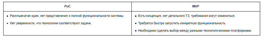 - Proof of Concept (PoC, подтверждение концепции). Такой прототип создается, чтобы проверить, можно ли с помощью рассматриваемых технологий реализовать необходимую функциональность. Он позволяет оценить скорость разработки, концепцию UI, риски или ограничения. Самое главное — PoC не предназначен для использования в продуктивной среде.
