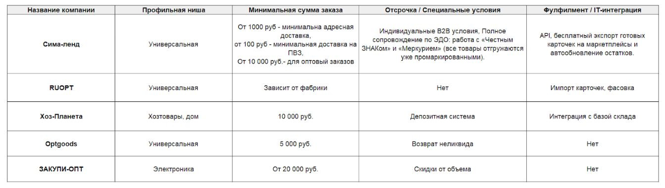 В наш итоговый рейтинг вошли проверенные российские поставщики маркетплейсов, которые предлагают по-настоящему выгодные условия и закрывают все базовые потребности селлеров. В сводной таблице ниже представлены ключевые игроки рынка, формирующие актуальный топ оптовых баз на 2026 год.