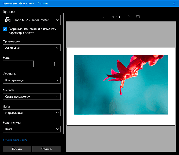 Данный метод наиболее простой и задействует только возможности встроенного приложения операционной системы «Windows 10» для доступа к пользовательским файлам. Откройте окно проводника файлов «Windows» любым удобным способом. Например, щелкните левой кнопкой мыши значок проводника, представленный в виде схематического изображения папки и расположенный на «Панели задач» в нижнем левом углу рабочего стола, для мгновенного непосредственного запуска востребованного приложения. Пошагово перемещаясь по представленным категориям проводника, перейдите к месторасположению изображения, которое необходимо распечатать, и щелкните правой кнопкой мыши выбранный файл для отображения всплывающего контекстного меню. Из списка доступных вариантов возможных действий, представленных в открывшемся меню, выберите раздел «Печать». Или выделите, щелкнув левой кнопкой мыши, искомую фотографию, потом на панели управления проводника файлов «Windows» перейдите во вкладку «Поделиться» и во всплывающей панели вложенных инструментов выбранной вкладки нажмите в разделе «Отправить» на кнопку «Печать». На экране появится новое окно «Печать изображений», содержащее предварительные настройки способа печати пользовательской картинки. Проверьте каждый из доступных параметров и установите приемлемые конкретные значения из предустановленных вариантов. Сначала убедитесь, что в поле «Принтер» установлен верный инструмент печати. Потом выберите формат, качество и тип используемой бумаги, отметьте желаемый макет и укажите требуемое количество копий изображения. Если необходимо, установите индикатор выбора («галочку») в связанной ячейке «Изображение по размеру кадра», позволяющей увеличить масштаб картинки, чтобы закрыть свободное место листа (однако края итогового изображения могут оказаться обрезанными). Для дополнительной настройки параметров печати нажмите на текстовую ссылку «Параметры», расположенную в правом нижнем углу окна, а затем в новом дополнительном окне выберите текстовую ссылку «Свойства принтера», для отображения всплывающего модуля вспомогательных настроек отмеченного принтера. Новое открывшееся окно будет содержать специфические персонализированные настройки для конкретной модели пользовательского печатного устройства. В нашем примере представлен упорядоченный набор свойств для принтера «Canon MP280». Задайте необходимые новые изменяемые параметры свойств. По окончанию, нажмите на кнопку «ОК», окно закроется, и пользователи будут перенаправлены обратно к исходному окну «Печать изображений». Нажмите на кнопку «Печать», чтобы завершить подготовительные процедуры настройки и запустить непосредственно процесс печати. Данное приложение входит в пакет стандартных программ операционной системы «Windows 10» и по умолчанию уже установлено на пользовательских персональных компьютерах. Поэтому нет необходимости дополнительно его скачивать и настраивать, потому как приложение сразу изначально готово к непосредственному использованию. Как правило, согласно заложенным в операционной системе параметрам, приложение «Фотографии» применяется в качестве средства просмотра любых изображений по умолчанию. Перейдите в окне проводника файлов «Windows» к месторасположению своих снимков и выберите нужную фотографию, которую требуется 