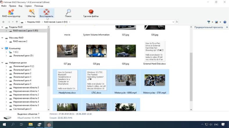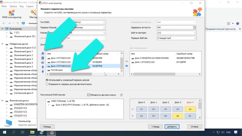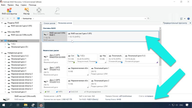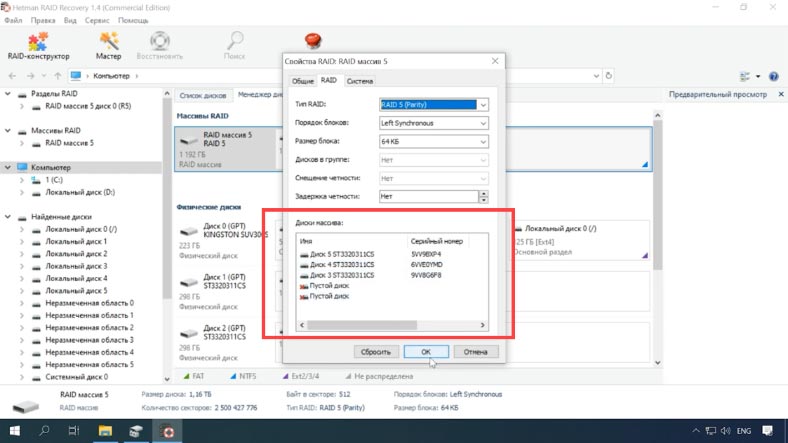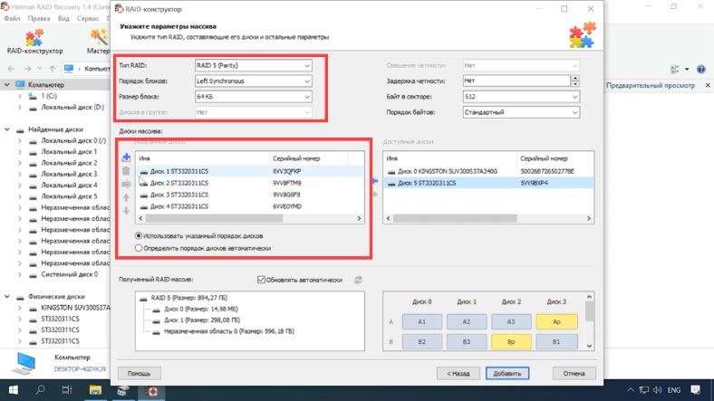 Чтобы вернуть информацию, нужно воспользоваться специальным ПО для восстановления данных, которое поддерживает такой тип RAID. Утилита Hetman RAID Recovery поддерживает почти все известные форматы RAID массивов, она поможет без труда восстановить удаленные данные. Программа поддерживает все популярные файловые системы. Она автоматически исправит любые ошибки логической структуры жестких дисков, просканирует дисковое пространство и отобразит содержимое. Сбой в работе операционной системы, например, в процессе обновления, может повлечь за собой появление критической ошибки, после которой ОС перестанет загружаться. В этом случае, самым простым решением остается ее переустановка. Но как быть с RAID5 массивом и всей хранящейся на нем информацией? После переустановки ОС может не распознать содержимое накопителей, то есть в управлении дисками она отобразит их как «чужие». Попробуйте сделать их импорт. Кликаем по иконке накопителя ПКМ, далее нажимаем «Импорт чужих дисков». Указываем группу и Ок. В следующем окне система отобразит список томов, которые она нашла на этих носителях, нажимаем Ок — подтверждаем операцию. После все накопители появятся в проводнике. Случаются ситуации, когда импорт заканчивается неудачей и некоторые массивы как в нашем случае с RAID 5 по-прежнему остаются недоступными. Или же после аппаратного сбоя и других непредвиденных ситуациях была повреждена часть метаданных. Или идет процесс бесконечной ресинхронизации, при которой диск остается недоступным для чтения или записи. Вы случайно удалили часть данных или отформатировали накопитель. В этом случае вам поможет утилита Hetman RAID Recovery. Она автоматически просканирует выбранные носители, выведет все доступные данные, которые смогла найти. В окне программы отображаются правильные параметры массива. Осталось просканировать логический том и восстановить найденную информацию. RAID Recovery™ 1.4Восстановление данных с поврежденных RAID-массивов, недоступных для компьютера.Скачать Кликаем ПКМ по иконке раздела, выбираем быстрый анализ. Просматриваем результаты сканирования, если утилита не смогла найти нужные данные, то запустите полный анализ носителя. После завершения сканирования, в результатах вам нужно отметить файлы, которые вы хотите восстановить, нажимаем кнопку «Восстановить». Пропишите путь к каталогу сохранения, обязательно укажите другой носитель, флэшку или сетевой диск, еще раз кликаем «Восстановить». Когда процесс сохранения будет завершен, вы найдете все файлы в ранее указанном каталоге. В том случае если один или несколько носителей повреждены, а Hetman RAID Recovery не смогла расшифровать точные правильные параметры RAID5 массива, то на помощь придет встроенный RAID-конструктор. Выберите пункт «Создание вручную» —Далее, укажите известные вам параметры, которые использовались при создании RAID5. Укажите тип массива, размер, порядок блоков, выберите носители, которые входили в ваш массив, обязательно укажите порядок расположения. Недостающие заполните пустыми, кликнув по кнопке «с плюсиком». После заполнения всех известных параметров нажмите Далее. Теперь заново собранный массив будет отображаться в менеджере дисков. Кликаем по иконке ПКМ чтобы запустить анализ устройства. Далее, как в выше описанном примере, отмечаем нужные файлы и папки, которые вы хотите восстан