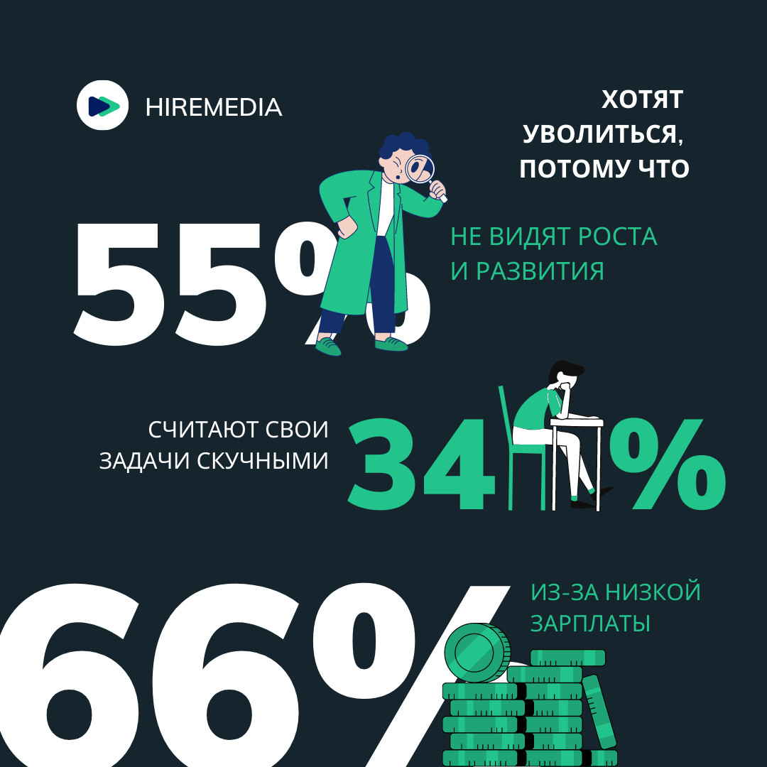 Причины на ладони. Сразу 66% опрошенных говорят, что их зарплата — низкая. Еще 55% озабочены тем, что не могут вырасти на текущем месте работы. Скучают из-за неинтересных задач около 34% опрошенных, а 30% считают, что руководители и коллеги оказывают им мало внимания.