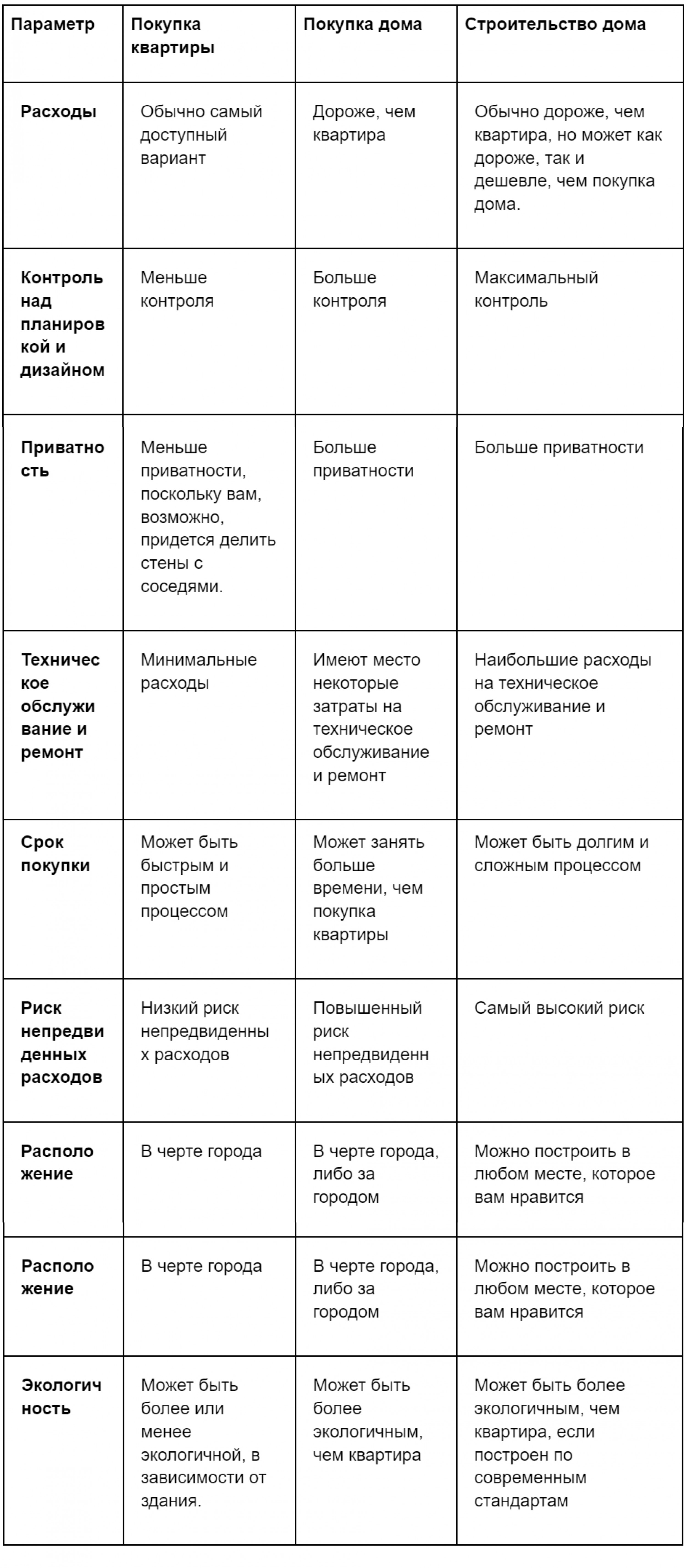 Три варианта покупки квартиры, покупки дома и строительства дома имеют разные преимущества и недостатки, и лучший вариант для вас будет зависеть от ваших индивидуальных потребностей и предпочтений. Рассмотрим основные параметры.