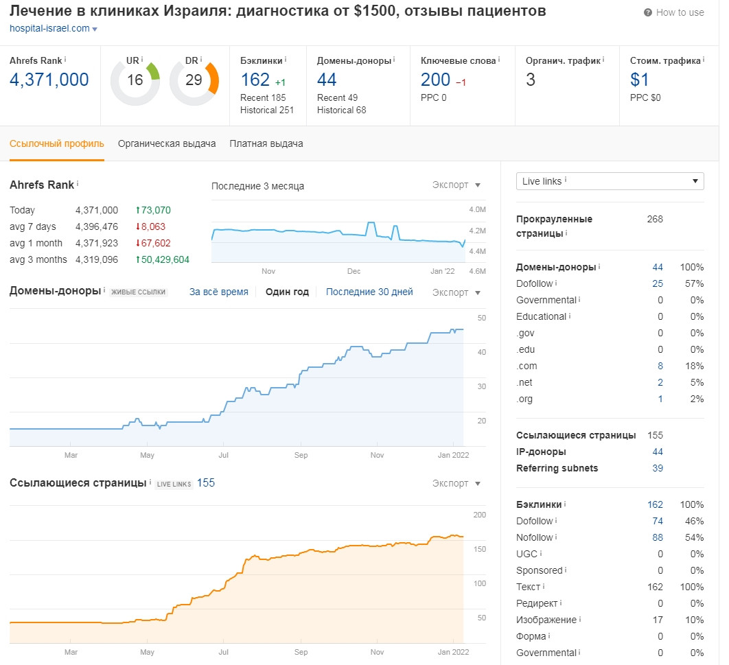 Поэтому в последние пару лет, если мы смотрим бэклинки конкурентов по медицинской тематике, например, через Ahrefs, то видим, что обязательно есть ссылки с доменов .gov и ссылки из СМИ. У сайтов медицинской тематики, которые не постарались сделать публикации связанные с контент-маркетингом позиции неизбежно падают.