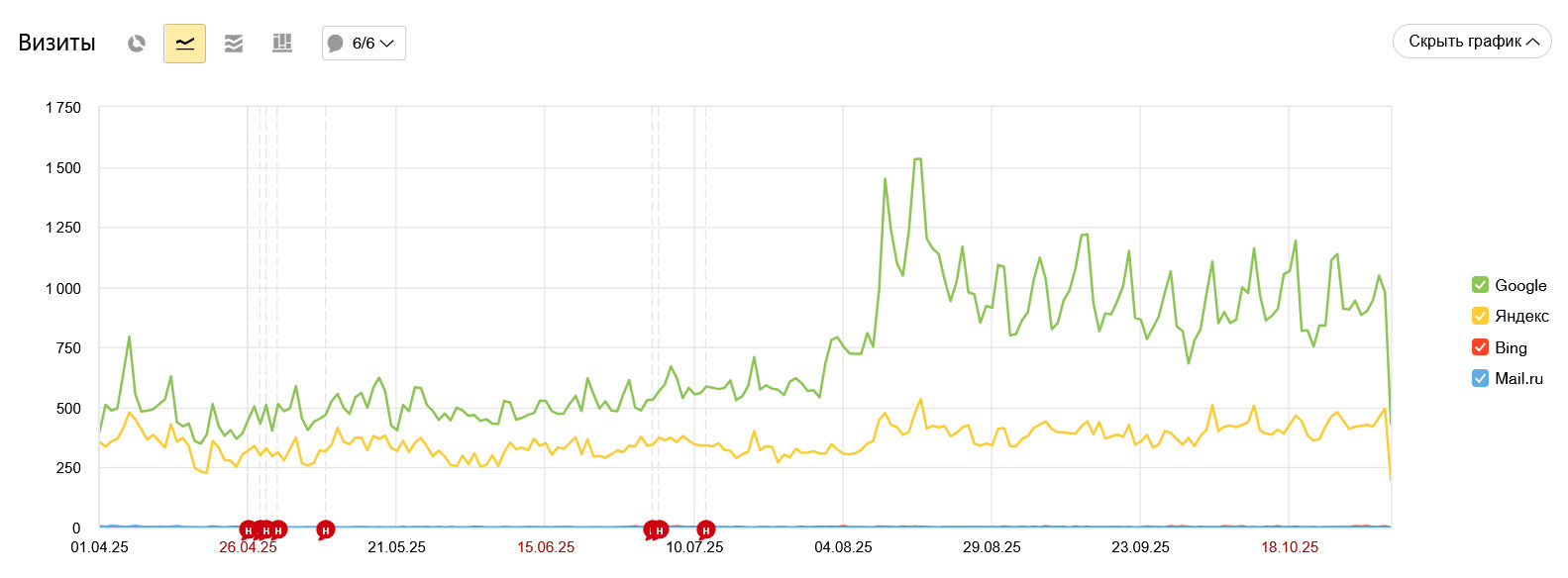 Всего через 6 месяцев активной работы мы не просто «подняли» сайт, а добились конкретных результатов, которые изменили бизнес нашего клиента. Вот ключевые цифры: