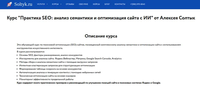 Алексей Солтык и его «Практика SEO: анализ семантики и оптимизация сайта с ИИ» https://soltyk.ru/course/praktika-seo