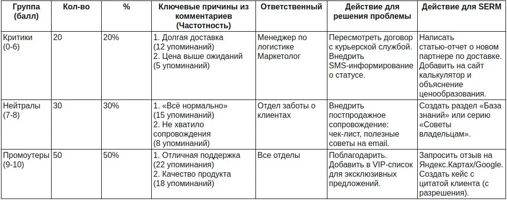 - Шаг 1. Анализ: соберите все комментарии «критиков» в таблицу. Выделите повторяющиеся темы (например, «долгая доставка», «непонятная инструкция», «высокая цена»).