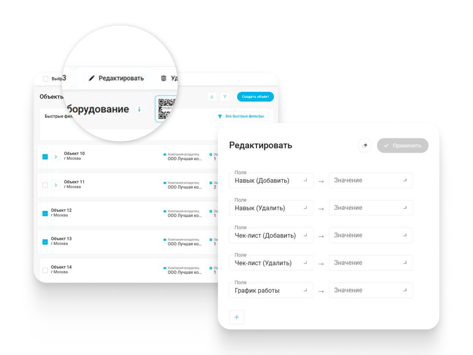 Для этого нужно отметить объекты, нажать кнопку «Редактировать» и в боковом окне выбрать один или несколько пунктов.