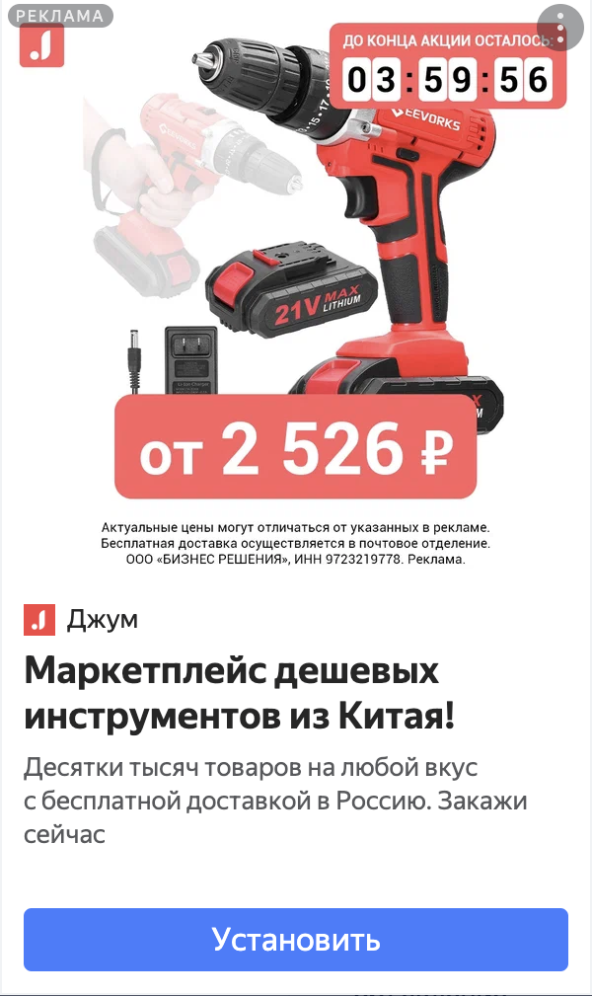 Мы в HunterMob уделяем много внимания производству визуала: и статичных баннеров, и видео. У Джум лояльный подход к креативам, поэтому мы смогли создать более нативные форматы, которые не выглядят как навязчивая реклама. Для Джум мы создали 300 видео и более 1000 статичных креативов. Вот некоторые из них: Показали платья со всех сторон на модели — это не живая девушка, а сгенерированная нейросетью. Так удалось сэкономить на съемках для создания креативов В категории товаров для рыбалки рекламировали базовые позиции, сделали акцент на низких ценах Чтобы вызвать интерес у людей, которые ищут кроссовки, показали модель, её цену и подчеркнули преимущество — бесплатную доставку Чтобы реклама эффективно работала, важно написать не что угодно, а составить понятный, конкретный и релевантный текст. Начинаем с заголовка — пользователи читают его первым. Вот каким он должен быть: На наших креативах заголовки созданы по этим правилам: соответствуют картинке, подчеркивают преимущество и выгоду для пользователей. Вот еще примеры креативов с удачными заголовками, которые мы в HunterMob создали для Джум: Креатив показывает товар с ценой, а чтобы стимулировать пользователей к действию, мы добавили обратный отсчет Заголовок «Маркетплейс дешевых инструментов из Китая» соответствует изображению: на Джум можно купить шуруповерт по такой низкой цене Заголовок адаптируется под товар: здесь уже Джум — маркетплейс детской одежды из Китая На креативы с заголовками по ключевым запросам часто кликают. В результате у таких объявлений высокая конверсия в целевое действие и низкая стоимость установки приложения. Мы запустили РК в Яндекс Директе за несколько шагов. Настроили интеграции рекламного аккаунта с мобильным трекером. Чтобы отслеживать установки приложения и действия пользователей после клика по рекламе, необходимо подключить трекинговую систему. Она «связывает» рекламные показы и переходы с реальными установками и событиями внутри приложения, а затем передает эти данные в Яндекс Директ. Это помогает точнее считать конверсию и оптимизировать кампании. Яндекс Директ работает с большинством популярных трекеров: AppMetrica, AppsFlyer, Adjust, Branch, Kochava, MyTracker, Singular, Tenjin и AirBridge. Чтобы отслеживать качество привлеченного трафика, мы использовали трекер Adjust. Как самостоятельно настроить трекеры, можно узнать в официальной справке Яндекс Директа. Мы в HunterMob рекомендуем сначала запустить одну рекламную кампанию в качестве теста. Так можно убедиться, что интеграция настроена верно, и Яндекс Директ получает все события, которые нужно отслеживать для анализа РК: установки, просмотр карточки товара, добавление в корзину, покупки. Илья Ариничев, Head of Media Buying Структурировали рекламный аккаунт. Правильная структура рекламного аккаунта — это основа эффективной работы. Мы распределили ключевые запросы и креативы по разным кампаниям и группам объявлений, чтобы каждая связка работала максимально точно. Такой подход помогает следить за результатами и быстрее находить работающие и неработающие решения. В структуре рекламного аккаунта ЕПК можно выделить три уровня: Назначили ставки для целей в рекламных кампаниях. При запуске новой РК важно грамотно назначить ставки. Чтобы быстрее собрать нужную статистику, лучше сразу задать ставку повыше — средняя стоимость установки 