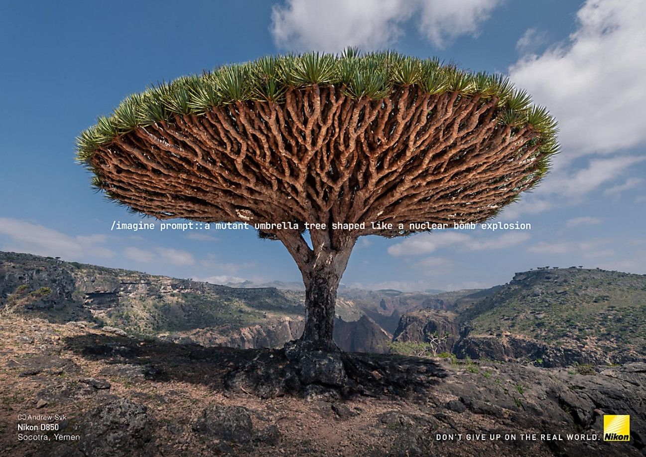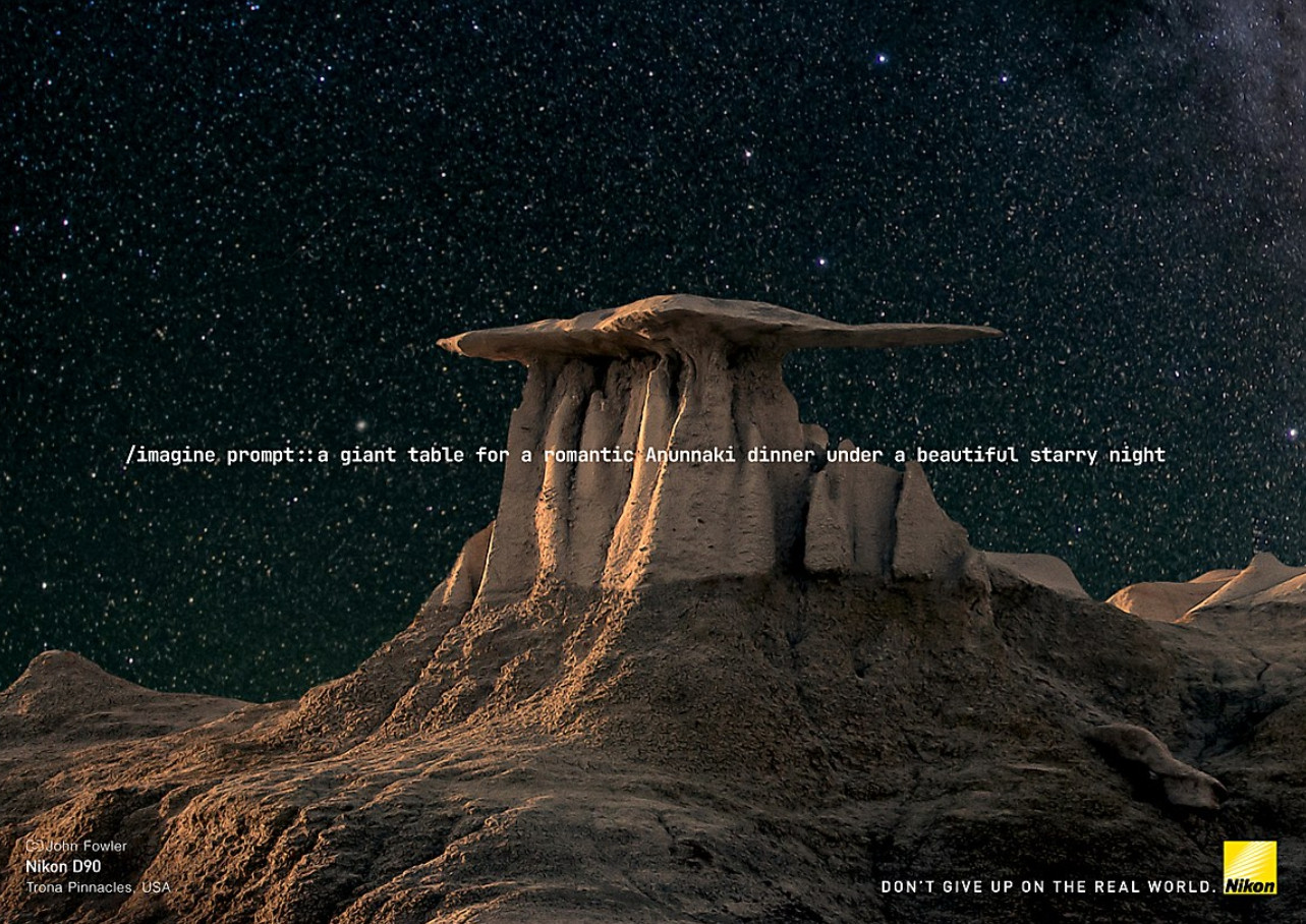 любым произведением, проектом должна стоять идея, и идея должна основываться либо на реалистичных данных, метриках, исследованиях целевой аудитории, либо на экспертности человека, который может это аргументировать. Вы можете сделать все в рекламном ролике ИИ-шкой. Все, кроме его «сердца». Копирайт, пэкшот, клейм и другие детали— все это придумывает человек. Если все-таки хочется «побаловаться», сделать что-то виральное, нужно думать о том, как спровоцировать эту историю. Вообще, история с провокацией — это прям конкретно направление латерального мышления и разрыва шаблонов. Это креативная методология о том, как удивлять людей. И на эту тему есть отличный пример. Посмотрите картинки выше. На первый взгляд можно предположить, что они сгенерированы нейросетью. Но в действительности это фотографии, сделанные на Nikon. Это билборды туристической компании, на которых написан промпт для нейронки, генерирующей картинки. И эти промпты соответствуют тому, что изображено на заднем фоне. Но при этом никакая нейронка, конечно же, не использовалась. Глобальная идея здесь заключается в том, что Земля полна удивительных артефактов и вы можете запечатлеть это на фотоаппарат, увидеть своими глазами, прочувствовать этот опыт. Видите, какая получилась провокация и как классно она работает на волне популярности нейронок. Здесь