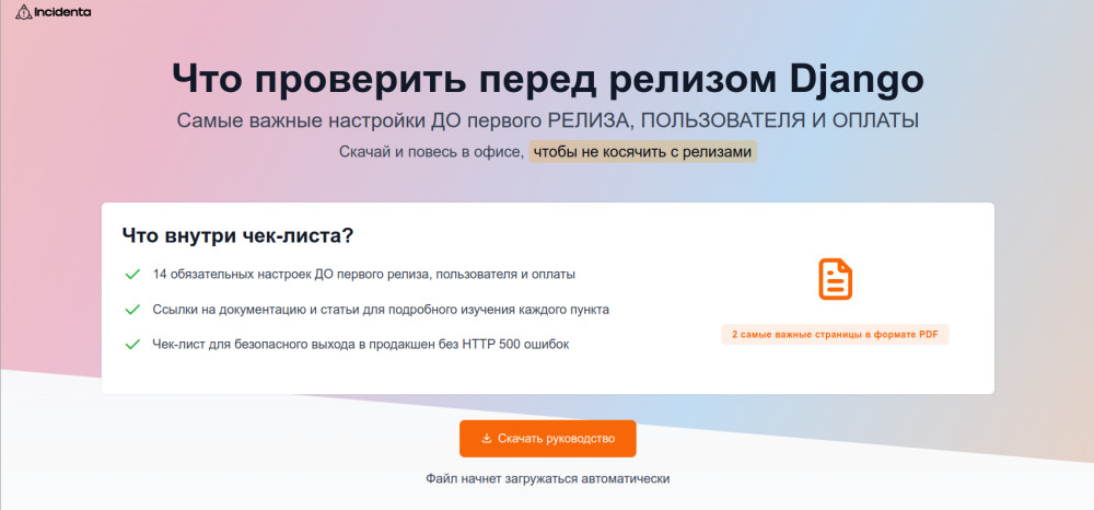 Гайд можно скачать на странице: https://app.incidenta.tech/guide/django-release-guide