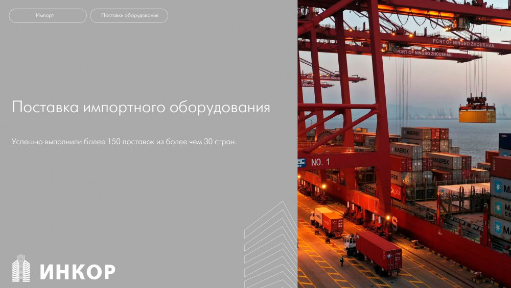 Компания ИНКОР является надёжным поставщиком товаров иностранного производства на территорию Российской Федерации. За многолетний опыт поставок было закуплено и доставлено до конечного потребителя: оборудование для производства, сырьё, техника и различные комплектующие к ней.