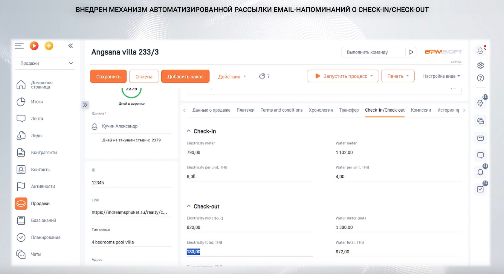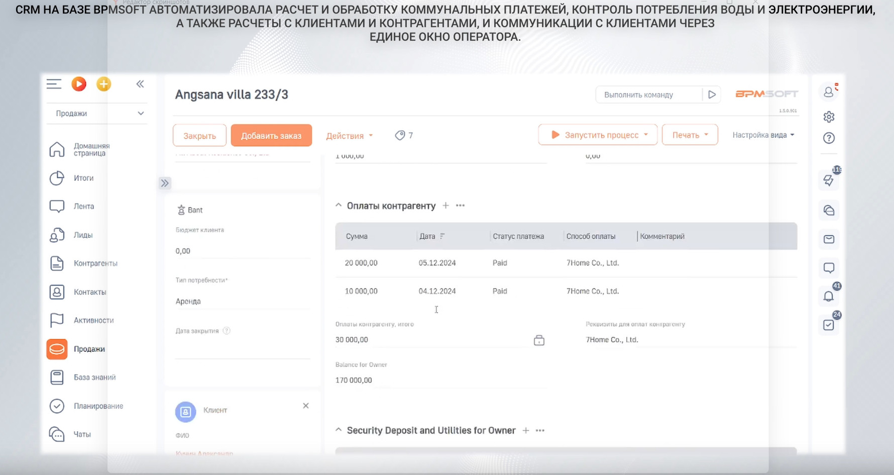 - управление продажами: включает в себя управление сделками с клиентами, а также автоматический расчет суммы платежей клиентов (авансовые, постоплатные) и оплаты контрагентам, автоматический расчет потребления воды и электричества по счетчикам;