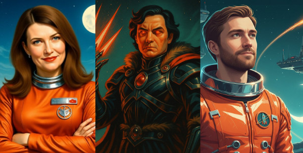 «Составь универсальный запрос для нейросетей, который позволит создавать реалистичные изображения людей в стилистике советского ретрофутуризма. Перед нами капитан звездолета в оранжевом экзокостюме с хромированным кольцом на воротнике, на фоне звездного неба...»