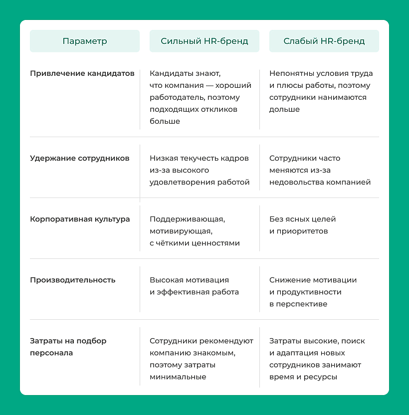 Удержание сотрудников. Если сотрудники гордятся своей работой, они вряд ли захотят уйти в другие компании. Когда HR-бренд компании строится на уважении, справедливой оплате труда и возможности профессионального развития, это снижает текучесть кадров.
