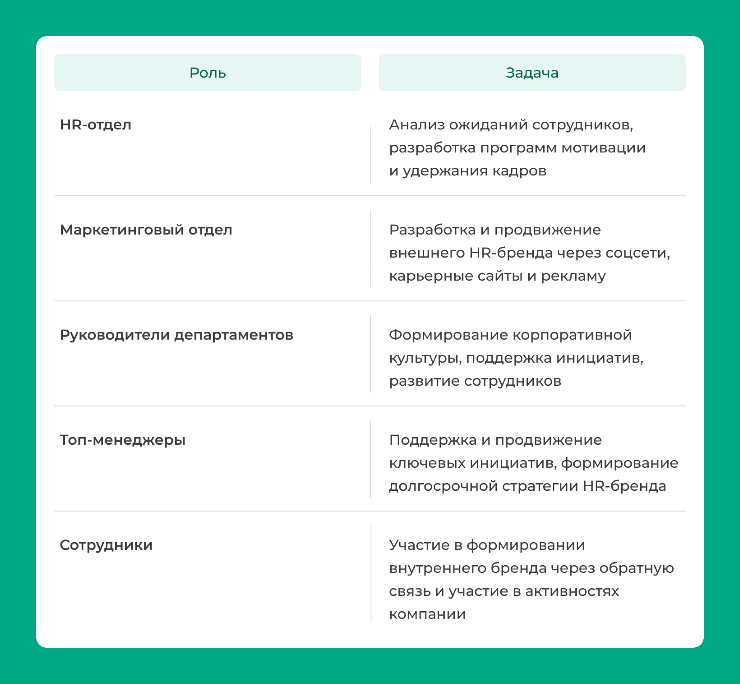 Снижение затрат на подбор персонала. Если компания известна как хороший работодатель, меньше ресурсов уходит на поиск сотрудников. Кандидаты приходят сами, а найм занимает меньше времени и денег. Сильный HR-бренд нужен компаниям, которые постоянно привлекают новые таланты и хотят удерживать текущих экспертов. Если вы только начинаете его формировать, вот план, как это сделать. Перед тем, как вкладывать деньги в HR-бренд и создавать пиар-программы, важно чётко сформулировать, чего нужно достичь. Для этого важно понимать текущие проблемы. Вот примеры, как можно формулировать цели HR-бренда в зависимости от текущей ситуации в компании. HR-бренд базируется на информации о компании: какие у неё основные ценности, миссия и цели, как они проявляются в ежедневной работе и проектах. Эти данные затем транслируются в ключевых посылах компании и создают уникальное ДНК бренда. Чтобы развивать HR-бренд, нужно понимать, что важно для нынешних и потенциальных сотрудников. Для этого стоит провести массовое анкетирование и точечные интервью, чтобы узнать, какие аспекты работы они ценят, а что требует улучшения. Пример: работодатель думал, что сотрудникам комфортнее работать из дома, поэтому хотел настроить удалённые процессы. Интервью показало, что работникам приятнее и эффективнее решать рабочие задачи из офиса, поэтому лучше инвестировать в его улучшение. Работники ценят не только зарплату, но и нематериальные бонусы: медицинская страховка, гибкий график и возможность обучения. Предложения должны соответствовать ожиданиям сотрудников, поэтому о них также лучше спросить в опросе. Корпоративная культура — это то, как компания транслирует ценности и миссию через мероприятия, социальные сети, слоганы на сайте, статьи в блоге. Важно, чтобы все источники соответствовали единой стратегии. Если корпоративная культура дружелюбная и поддерживающая, климат в коллективе будет положительным, а сотрудникам не захочется увольняться. Прозрачные коммуникации — часть качественной корпоративной культуры, которая создаёт атмосферу доверия. Для этого сотрудники должны понимать, какие цели преследует компания, как их вклад помогает достигать этих целей, и что их ждёт в будущем. Сотрудникам важно видеть, что компания развивается, и расти вместе с ней. Для этого нужно не только предлагать карьерный рост, но и помогать с обучением и развитием навыков. Например, если в компании развита программа наставничества, каждый сотрудник может учиться у более опытных коллег. Соцсети, карьерные сайты и отзывы сотрудников помогут донести до кандидатов, почему стоит выбрать именно вашу компанию, а не вакансию конкурента. Создание HR-бренда — процесс, в котором задействованы разные участники. Вот кто может вовлекаться в создание и развитие HR-бренда. HR-отдел. HR-специалисты проводят исследования, что важно для сотрудников и кандидатов, а на основании результатов разрабатывают стратегию улучшения бренда. Они также реализовывают инициативы, которые улучшают опыт сотрудников: создают программы обучения, корпоративные мероприятия, индивидуальные планы развития. Маркетинговый отдел или команда HR-маркетологов. Специалисты по маркетингу участвуют в создании внешнего бренда, так как знают, как лучше всего представить компанию на рынке труда. Они могут создавать контент для сай