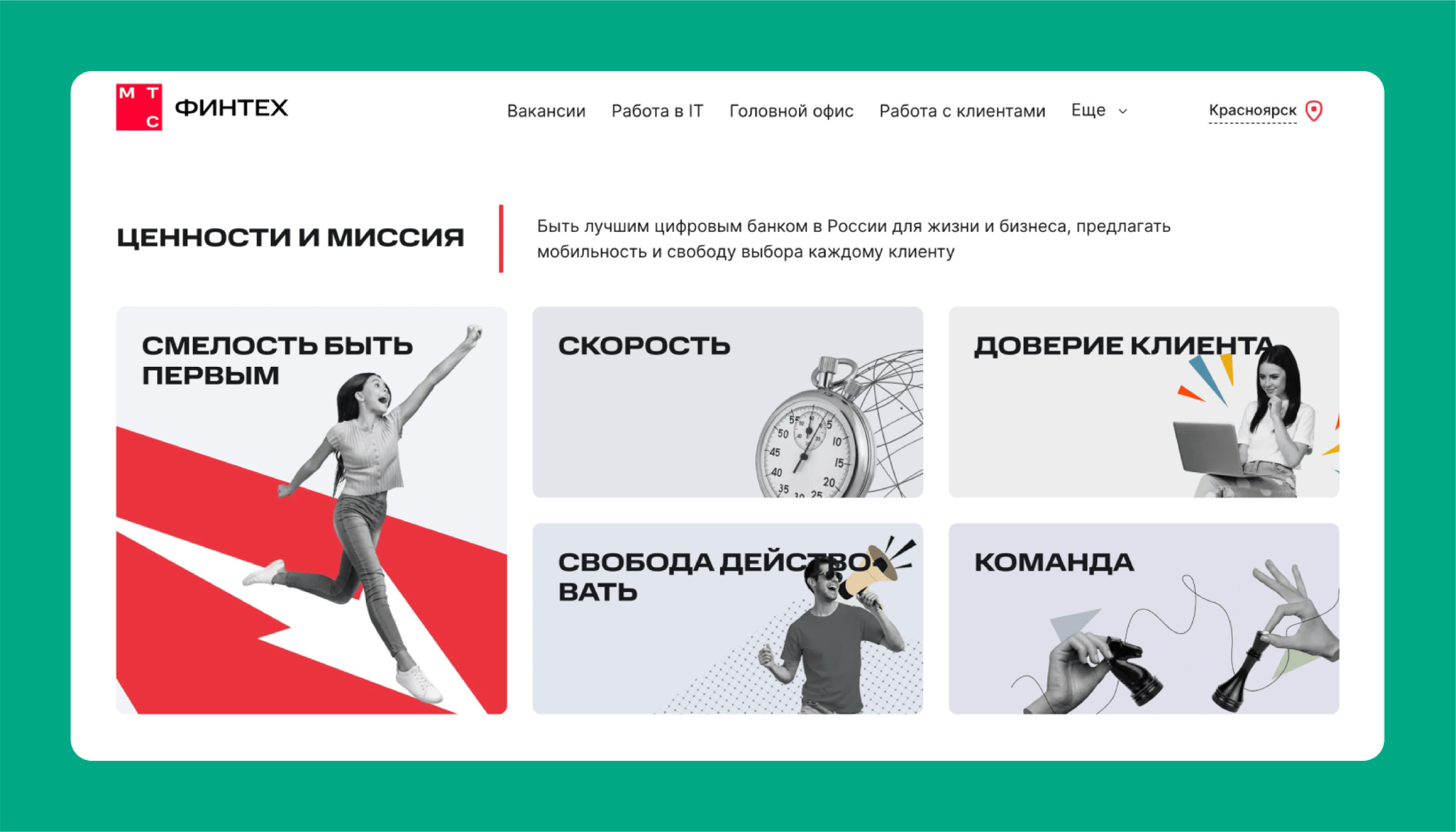 Корпоративная культура: атмосфера и ценности, которые поддерживаются в коллективе. Например, внедрение инициатив сотрудников в улучшение процессов, гибкость в решении рабочих вопросов, неформальное общение между отделами.