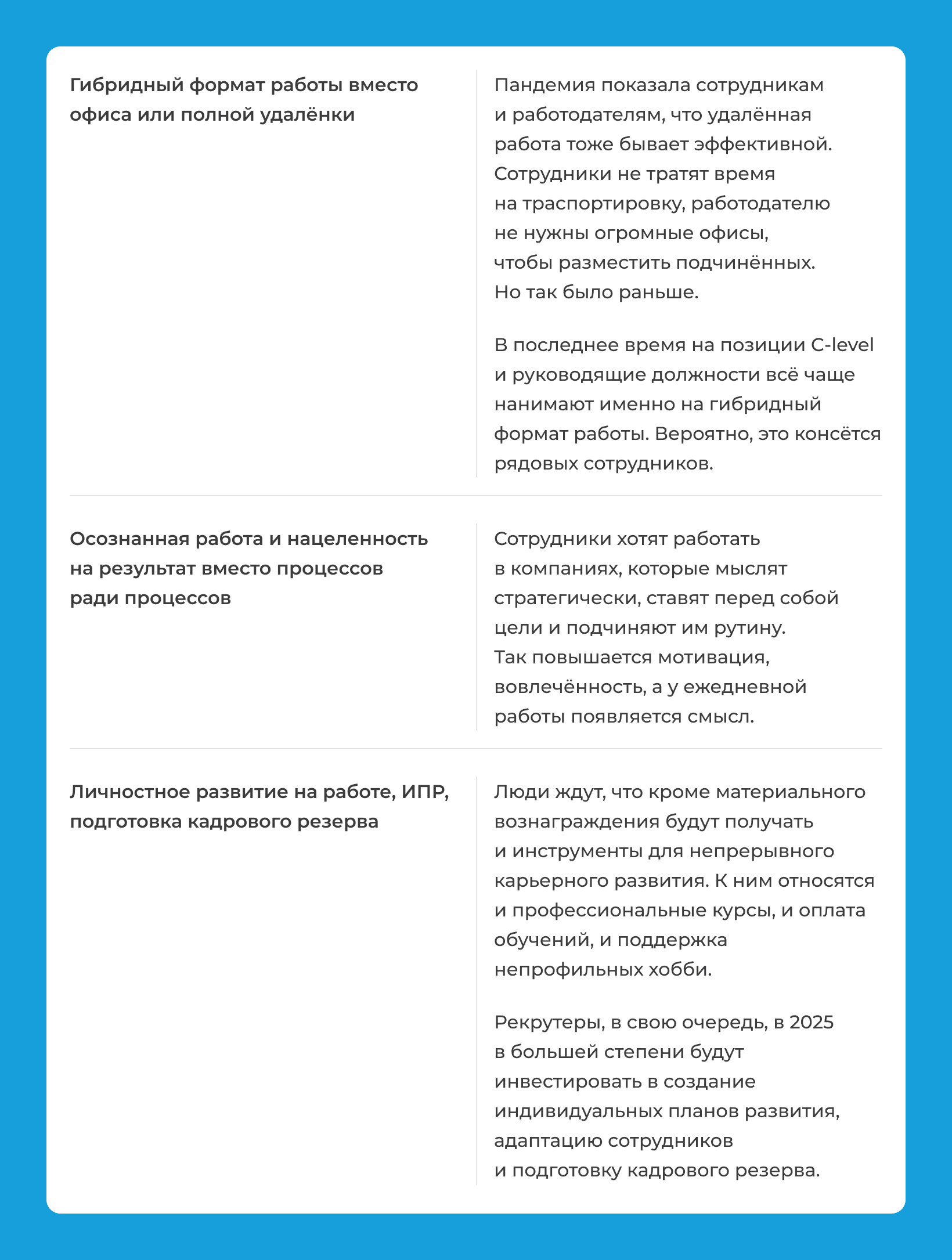 Рынок найма меняется. У соискателей теперь другие приоритеты, и зарплата — не самый важный критерий, который влияет на выбор работодателя. Рассмотрим, что изменилось на привычном рынке труда в 2024 году и как это повлияло на функциональность HR-систем. Современные HR-технологии развиваются с учётом этих тенденций: облегчают труд рекрутерам и другим сотрудникам. Помогают управлять развитием персонала, оптимизируют внутренние процессы компании, например, позволяют бронировать рабочие места работникам или подписывать документы при помощи электронного документооборота. Далее мы подробнее расскажем о разновидностях систем: что это и зачем необходимо. В КЭДО можно подписывать документы в онлайн-формате в несколько кликов. Это удобно для найма удалённых и офисных специалистов. Благодаря ним больше не нужно отправлять оригинал договора транспортной компанией удалённому сотруднику, а офисному — тратить время на визит в отдел кадров или бухгалтерию. КЭДО позволяет: На найм сотрудника тратятся значительные средства. И становится крайне неприятно, когда на испытательном сроке работник понимает, что ошибся с выбором компании, и отказывается от дальнейшего сотрудничества. Чтобы такое происходило как можно реже, работодатель помогает с адаптацией новичков. Во время онбординга новый сотрудник знакомится с культурой компании, ценностями, корпоративными сервисам и процессами. Тогда новичок допустит минимум ошибок на новой должности и сможет быстрее включиться в работу. Компании, которые заботятся об адаптации персонала, привлекают для помощи новичкам наставников или бадди. Но помимо этого способа есть ещё и другая возможность помочь сотрудникам, например, использовать решения HR-Tech: Компании, в которых есть системы развития персонала, более устойчивые. Сотрудники, которым работодатель позволяет развиваться, ценят свою работу, выполняют её качественно и ответственно, вовлекаются в проекты и не относятся к ним формально. Всё это также помогает снизить текучку кадров и усиливает HR-бренд. Чтобы реализовать для сотрудников возможность развиваться, используют корпоративные онлайн-платформы. Решения HR-Tech дают отложенный качественный и количественный результаты. Разберём, что получают компании, которые используют HR-инструменты для реализации своей стратегии. Решения HR-Tech можно внедрить в любые этапы работы с персоналом. О том, как автоматизировать процессы, рассказали в другой статье, а здесь поделимся информацией о том, что обычно автоматизируют крупные компании. Контекст. Альфа-Банк — крупнейший банк России с 800 отделениями более чем в 1000 городах страны. Каждый день банку требуется около тысячи новых сотрудников разных специальностей во всех городах России. В качестве инструмента для решения такой масштабной задачи в компании выбрали карьерный сайт. В 2020 году Альфа-Банк обратился в Иностудио, чтобы мы улучшили действующий сайт — сделали современным и удобным. Результат. Мы разработали привлекательный карьерный сайт и настроили необходимые интеграции с E-Staff, Google reCAPTCHA v3, DaData и другими. Есть разделение на направления вакансий и продуман пользовательский путь кандидата. Итог совместной работы с клиентом за 3 года — количество посетителей на сайт выросло в 3,2 раза, показатель конверсии из посетителя в отклик — в 3,5 раза. Контекст. 