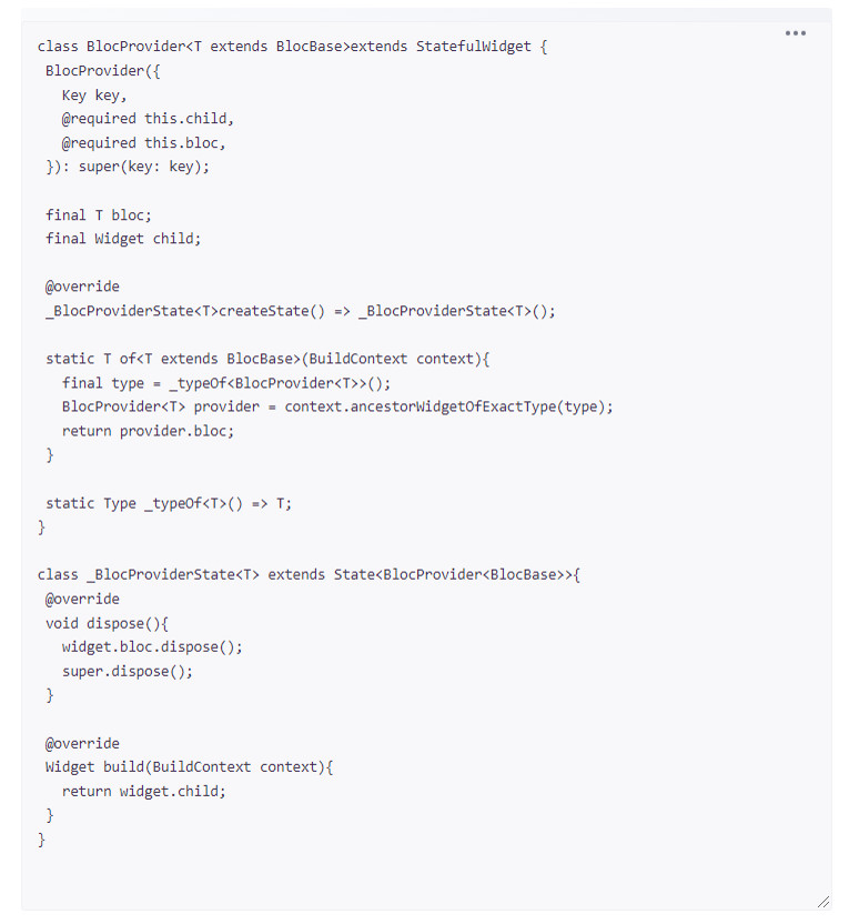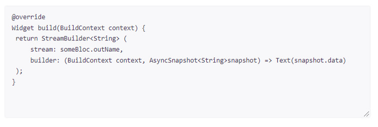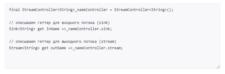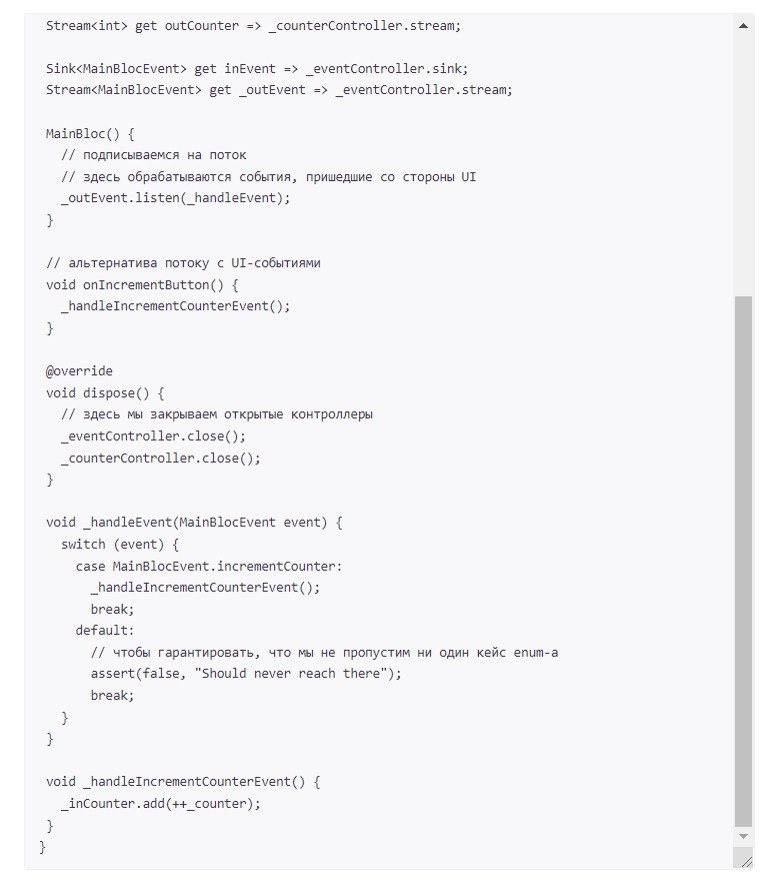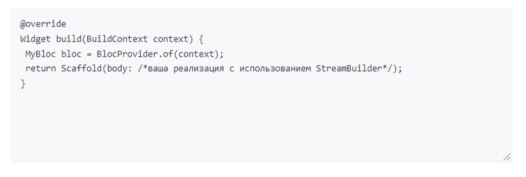 Для реализации реактивных сценариев язык Dart по умолчанию предлагает класс StreamController. Он позволяет нам моделировать поток данных с помощью двух составляющих — sink (входной поток, куда пользователь добавляет события) и stream (выходной поток, который слушают один или несколько объектов и реагируют на изменения). Пример описания входа-выхода для экрана в коде Bloc-а выглядит следующим образом: final StreamController_nameController = StreamController(); // описываем геттер для входного потока (sink) Sink get inName =>_nameController.sink; // описываем геттер для выходного потока (stream) Stream get outName =>_nameController.stream; Отдельные геттеры удобно делать по следующим причинам. Во-первых, так гораздо проще, чем каждый раз писать nameController.sink, во-вторых, вы даете входу/выходу осмысленное имя, что позволяет легче понять его назначение и тем самым улучшает читабельность. Код метода build для вашего виджета может выглядеть так: @override Widget build(BuildContext context) { return StreamBuilder ( stream: someBloc.outName, builder: (BuildContext context, AsyncSnapshotsnapshot) => Text(snapshot.data) ); } Здесь мы создаем специальный виджет StreamBuilder. Первым аргументом указываем поток, который поставляет данные нашему виджету, вторым — функцию, «собирающую» виджет на основе отрисовочного контекста и данных, асинхронно приходящих из потока. Для реализации BLoC часто используются уже готовые библиотеки, например, эта. Нашей же команде она показалась слишком тяжеловесной, поэтому мы воспользовались кастомной, упрощенной реализацией, описанной в этой статье. Рассмотрим ее основные положения. Каждый Bloc поддерживает общий интерфейс BlocBase, содержащий в себе только один обязательный к реализации метод dispose. Он нужен, чтобы не забыть реализовать освобождение ресурсов, занятых Bloc-ом, например, закрыть активные потоки. Выглядит он так: abstract class BlocBase { void dispose(); } Для того чтобы вы могли получить доступ к Bloc-у из любого узла дерева виджетов, корнем этого дерева становится такая сущность, как BlocProvider. Рассмотрим ее код: class BlocProviderextends StatefulWidget { BlocProvider({ Key key, @required this.child, @required this.bloc, }): super(key: key); final T bloc; final Widget child; @override _BlocProviderStatecreateState() => _BlocProviderState(); static T of(BuildContext context){ final type = _typeOf>(); BlocProvider provider = context.ancestorWidgetOfExactType(type); return provider.bloc; } static Type _typeOf() => T; } class _BlocProviderState extends State>{ @override void dispose(){ widget.bloc.dispose(); super.dispose(); } @override Widget build(BuildContext context){ return widget.child; } } Идея заключается в том, что наш провайдер, точно такой же виджет, который состоит из двух слагаемых: Bloc, к которому будут обращаться виджеты, и дерево виджетов, которое мы видим на экране. Для доступа к Bloc-у в методе виджета build вам нужно написать так: @override Widget build(BuildContext context) { MyBloc bloc = BlocProvider.of(context); return Scaffold(body: /*ваша реализация с использованием StreamBuilder*/); } Доступ к Bloc-у под капотом реализован очень просто. Мы движемся вверх по иерархии виджетов в рамках BuildContext, пока не встретим BlocProvider. Как только это произошло, мы можем вернуть Bloc этого провайдера. Небольшое уточнение по поводу оптимизации. Поиск по иерархии виджетов имеет вычислительную сложность O (n). Если ваш провайдер расположен относительно близко к виджету, который запросил Bloc, такая операция не займет много времени. Однако в случае, когда ваш виджет имеет большую глубину вложенности, а доступ к Bloc-у ему требуется часто, это может сказаться на производительности. Тогда есть смысл подумать о том, чтобы кэшировать ссылку на Bloc, например, передавая его как аргумент в конструктор виджета. Рассмотрим, как работа с BLoC-архитектурой мо