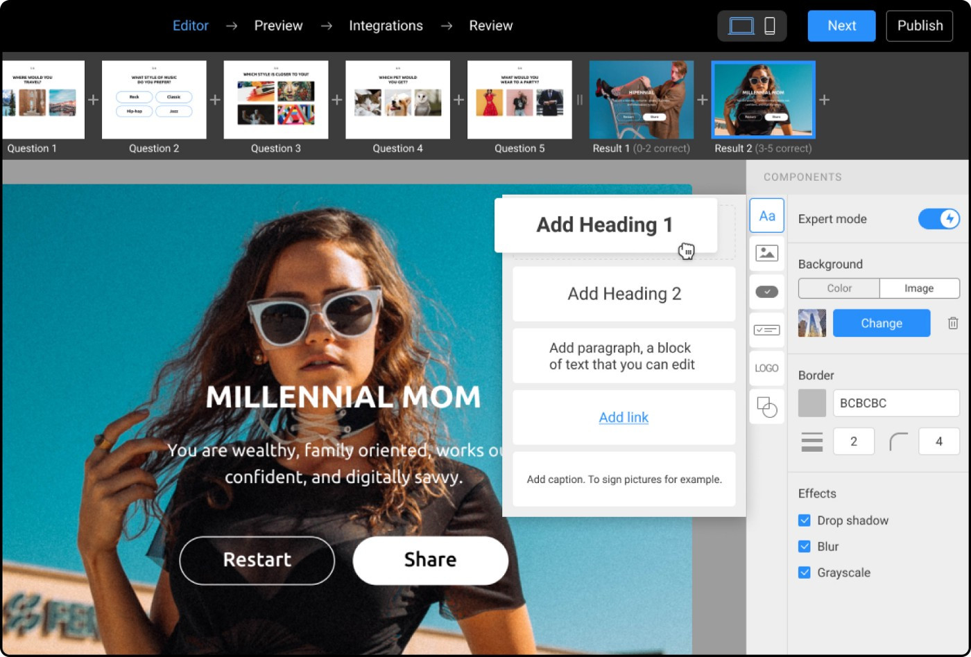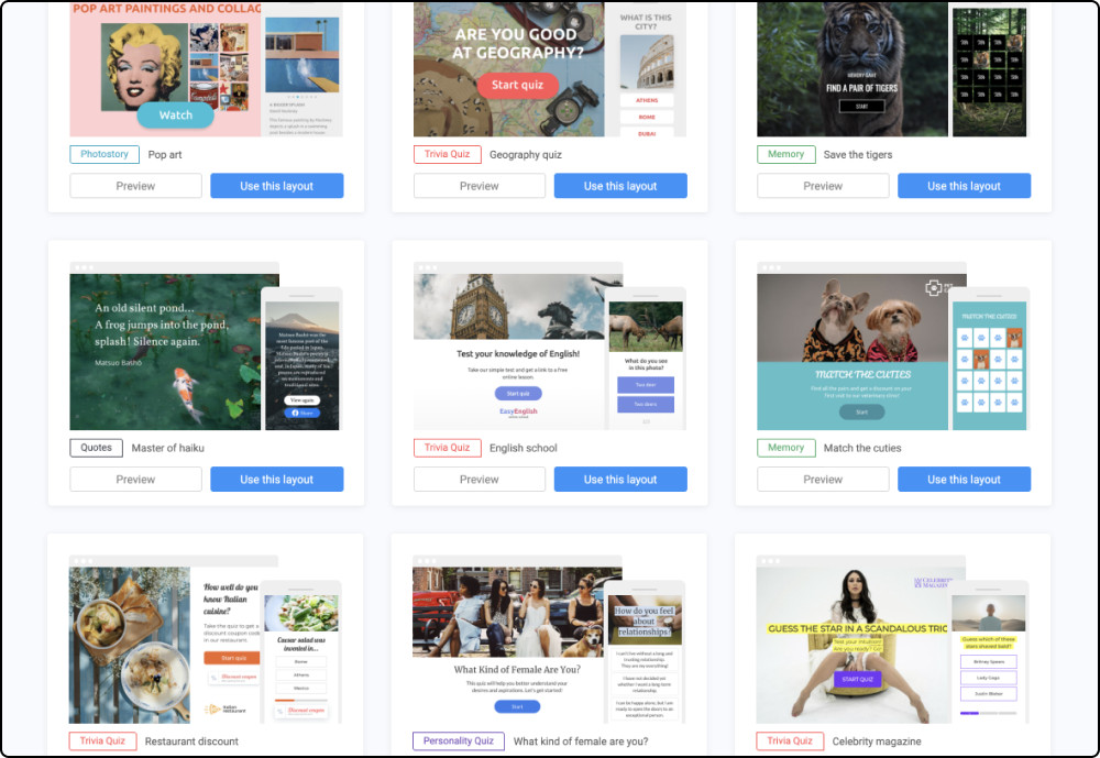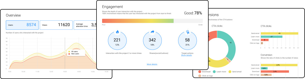 Хорошие новости! Теперь не нужно тратить время на поиски сервисов и иметь кучу подписок, если сегодня вам понадобился маркетинговый квиз, а завтра — игра Мемори или интерактивное слайдшоу. С помощью конструктора интерактивного контента Interacty.me вы сможете реализовать практически любую идею. Уже сейчас на платформе доступны 2 вида тестов («Узнай себя» и «Проверь себя»), игра Мемори, фотоистория (интерактивное слайдшоу), формат «до и после», цитаты, рейтинг-баттл, интерактивная карта (Zoom), Flip, встраиваемые статьи... Новые форматы появляются регулярно. Кроме того, Interacty позволяет собирать целые статьи и встраивать их на сайт при помощи embed-кода, что значительно облегчает жизнь онлайн-изданиям. Interacty.me предлагает один из самых продвинутых редакторов интерактивного контента: режим «Эксперт» позволяет перетаскивать элементы из библиотеки прямо в ваш проект. Добавляйте кнопки, картинки, варианты ответов, логотипы, тексты — все это в произвольном порядке. Теперь только вы решаете, каким будет дизайн вашего проекта. У вас строгое издание — выберите подходящие шрифты и монохромные кнопки. Яркий лайфстайл-журнал? Используйте яркие цвета и необычные дизайнерские решения. А главное, все возможности редактора доступны для всех пользователей, в том числе и на бесплатном тарифе. Благодаря игровой механике теста вы можете помочь аудитории с выбором товара или услуги и предложить вашим пользователям то, что им действительно нужно. Конверсия в заявку в этом случае значительно выше, чем у обычной формы контактов. Сэкономьте время с библиотекой шаблонов. Дизайнеры Interacty позаботились о том, чтобы вам было из чего выбрать. Просто найдите подходящий шаблон и отредактируйте его — проект сразу готов к публикации. Не нужно тратить время на подключение сторонних сервисов для отслеживания эффективности ваших проектов. Все самые интересные метрики доступны прямо у вас в личном кабинете. Начать создавать проекты на Interacty можно совершенно бесплатно. Весь основной функционал доступен на тарифе Free без ограничений по времени.