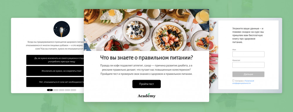 Выберем шаблон «English school» и сделаем на его основе маркетинговый квиз для онлайн-курсов про здоровое питание. Нажмите «Использовать шаблон». Если вы не зарегистрированы, то сервис предложит создать аккаунт (это бесплатно и займет меньше минуты). Если у вас уже есть аккаунт, то вы сразу же попадете в редактор Interacty. Итак перед вами — редактор. В верхней части находятся превью всех страниц проекта. Давайте сразу перейдем к оформлению страниц с вопросами, а обложку и результаты оставим «на сладкое». Откроем первую страницу с вопросом и впишем наш собственный текст. Для примера мы взяли текст из похожего теста в журнале Сноб. Готово? Теперь выделим все блоки и сдвинем их вниз, чтобы вверху осободилось место — туда мы добавим картинку. Для этого включите режим «Эксперт» на панели справа (1), нажмите на иконку картинки (2) и кликните по круглому изображению (3). Перетаскивание тоже работает. Теперь заменим картинку. Для этого выделим круглое изображение и на панели справа нажмем на кнопку загрузки («Изменить»). Перед вами появится всплывающее окно с возможностью выбрать или загрузить изображения. Для тестов вроде нашего отлично подойдут изображения из бесплатной библиотеки Unsplash. Немного подкрутим цвета и у нас получится стильная страница с вопросом и ответами. Например такая: Не забудьте указать, какой ответ является верным. Для этого выберите нужный ответ и в появившемся меню нажмите «Назначить верным». Важным компонентом теста «Проверь себя» является пояснение к ответу (так называемый фидбек). В тестах Интеракти фидбек показывается в виде попапа после ответа на вопрос. Включите галочку на панели слева (1) и нажмите на иконку странички фидбека под слайдами (2). Здесь вы можете расписать, где верный, а где неверный ответ и почему. Слева подсвечен тот ответ, к которому этот фидбек относится. Добавим наш текст на все 3 страницы фидбека и можно двигаться дальше! Проверьте, как выглядит страница с вопросом на мобильных девайсах. Для этого перейдите в режим мобильного редактора и при необходимости подвиньте «расползшиеся» элементы. Теперь удалим остальные страницы шаблона — нам они ни к чему. Гораздо удобнее воспользоваться функцией клонирования страниц :) При клонировании наследуется дизайн не только самой страницы, но и страниц фидбека, которые мы только что настроили. Вот так: Теперь останется только пройтись по страницам и вставить нужный текст и картинки — ваши вопросы готовы! Теперь настало время сделать обложку. Здесь все просто — дайте волю своему внутреннему дизайнеру. При желании вы можете добавить логотип или информацию о бонусах для прошедших тест. Все элементы, которых нет в шаблоне, можно добавить при помощи уже знакомой панели в режиме «Эксперт». У нас получилась такая обложка: В нашем шаблоне изначально 2 результата («неважно» и «хорошо»). Чтобы добавить больше градаций — добавьте больше страниц с результатами. Распределение результатов произойдет автоматически. Посмотреть его можно во вкладке «Проверка». С результатами поступим также, как и с вопросами — настроим одну страницу (не забыв про мобильную версию) и клонируем ее. При этом первый результат слева будет для наименьшего результата, последний (справа) — для наилучшего. Редактор Интеракти позволяет настроить отображение вашего проекта в соцсетях. Для этого перейди