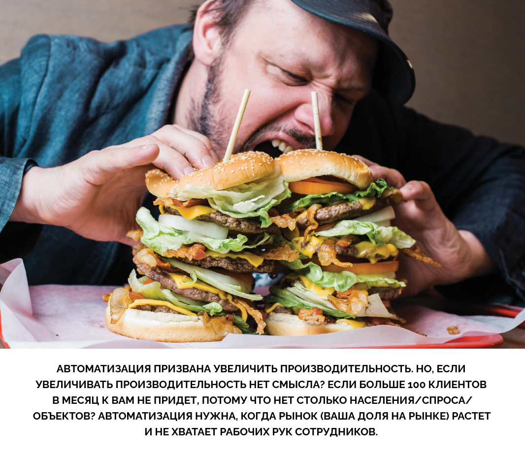 Автоматизация призвана увеличить производительность. Но, если увеличивать производительность нет смысла? Если больше 100 клиентов в месяц к вам не придет, потому что нет столько населения/спроса/объектов? Автоматизация нужна, когда рынок (ваша доля на рынке) растет и не хватает рабочих рук сотрудников.