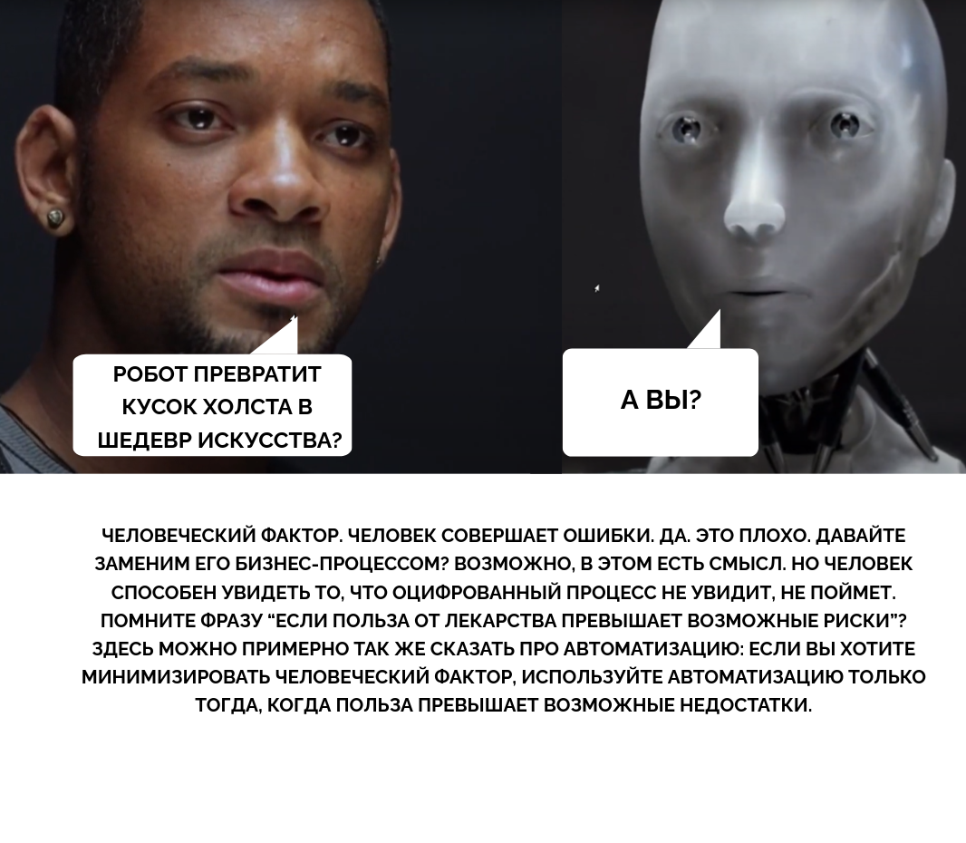 Пример 3 Теперь зайдем с другой стороны. Вы поняли, что автоматизация не увеличит производительность. Но, если вы за счет автоматизации сократите свои расходы... Согласитесь, это уже совсем другой разговор! Пример 4 Человеческий фактор. Человек совершает ошибки. Да. Это плохо. Давайте заменим его бизнес-процессом? Возможно, в этом есть смысл. Но человек способен увидеть то, что оцифрованный процесс не увидит, не поймет. Помните фразу «Если польза от лекарства превышает возможные риски»? Здесь можно примерно так же сказать про автоматизацию: если вы хотите минимизировать человеческий фактор, используйте автоматизацию только тогда, когда польза превышает возможные недостатки. Пожалуй, можно вывести правило из всего, что уже написали: Если люди могут выполнять задачи с тем же процентом ошибок, по такой же стоимости, с такими же издержками, смысла в автоматизации нет.