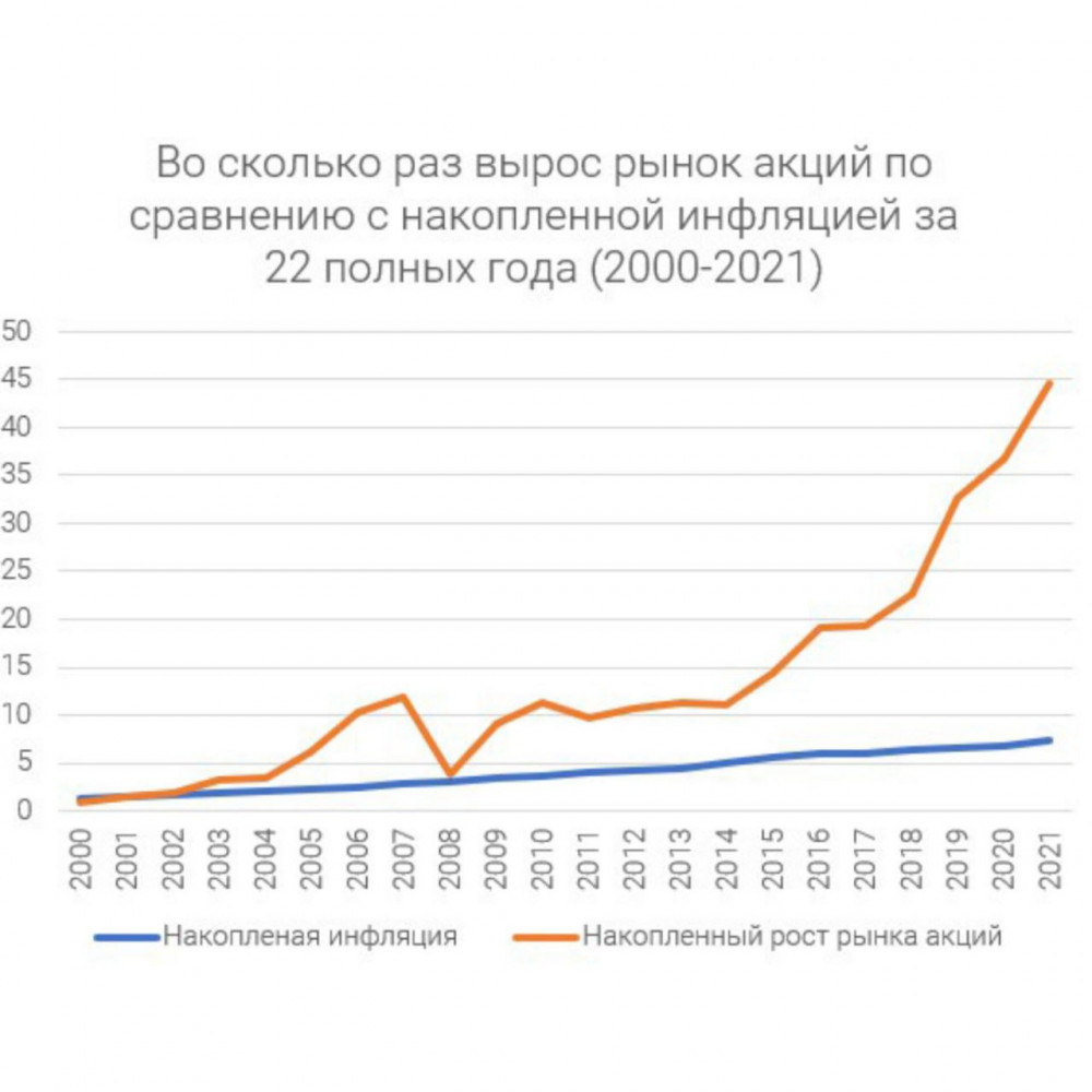 Долгосрочная цель инвестиций — обогнать инфляцию, то есть получить возврат вложенных денег, который компенсирует рост цен. Можно ли в России это делать? Опять посмотрим на статистику: российский рынок акций за период с 2000 по 2021 годы вырос примерно в 45 раз. Цены за этот же период выросли в 8 раз, рынок акций — в 45 раз. Это и есть инвестирование, то есть защита и приумножение сбережений.