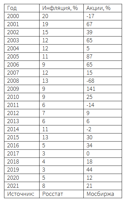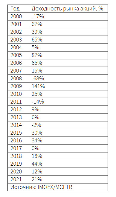 При этом среднегодовая инфляция в 2000–2021 годах составляла примерно 10%. В 2024 году Банк России планируется вернуться к цели по инфляции 4%. То есть доходности на левой стороне спектра — банковские вклады — часто даже не будут защищать от инфляции. Поэтому если хранить свои сбережения только в банках, инвестор будет получать отрицательную реальную доходность. Реальную доходность можно грубо посчитать как фактическая (номинальная) доходность минус инфляция. Это не значит, что банковские вклады нужно избегать — это хороший инструмент для достижения краткосрочных финансовых целей (менее года) и хранения резервного фонда. Преимущество банковских вкладов не в доходности, а в надежности (страховка Агентства по страхования вкладов) и возможности забрать деньги в любой момент (хотя и с потерей процентов, если вклад на определенный срок). На правой стороне спектра с точки зрения соотношения риска и доходности находится собственный бизнес. Предприниматель, который вкладывает капитал в собственное дело, может рассчитывать на такую доходность, какую может обеспечить его предпринимательский талант. Но и риски в собственном бизнесе максимальные: предприниматели иногда не просто теряют весь свой капитал, но и остаются должны кредиторам. Хотя кажется, что предприниматель полностью контролирует денежные потоки в своём деле, это не освобождает от влияния неопределенности — слишком много факторов может повлиять на итоговый результат в малом бизнесе. От предпринимателя на самом деле зависит не так уж и много. Неопределенность будущих денежных потоков максимальная, поэтому и потенциальный доход самый высокий. Где-то посередине в этом спектре находятся инвестиции на рынке ценных бумаг — акции и облигации. Причем облигации по соотношению риска и доходности ближе к банковскому вкладу, так как облигации — это долговые ценные бумаги. Акции ближе к собственному бизнесу, так как акции — это долевые ценные бумаги, которые по сути являются долей в крупном бизнесе. Если посмотреть на индекс государственных облигаций, то с начала 2003 года по конец 2021 года (за 19 полных лет) инвестиции в государственные облигации могли бы принести среднегодовую доходность немного меньше 10%. То есть и по государственным облигациям реальная доходность была бы отрицательной. Но государственные облигации не обязательно должны обгонять инфляцию. Как и по банковским вкладам, их основное преимущество — надёжность. Денежные потоки по государственным облигациям абсолютно предсказуемы, а банкротство государства вообще невозможно. Государственные облигации можно использовать для достижения относительно краткосрочных целей (до 3 лет), для долгосрочного роста капитала они не подходят, так как не обгоняют инфляцию. Посмотрим на доходность рынка акций. С начала 2000 года по конец 2021, то есть за 22 полных года, среднегодовая доходность российского рынка акций составляла около 18% годовых. При среднегодовой инфляции на этом же промежутке 10% реальная доходность акций 8% годовых. В спектре по соотношению риск-доходность вложения в акции оказываются ближе к собственному бизнесу. Реальная доходность по государственным облигациям отрицательная или близка к нулю, реальная доходность по акциям 8% годовых. Эта надбавка в доходности называется риск-премия. Премия за риск компенсирует в
