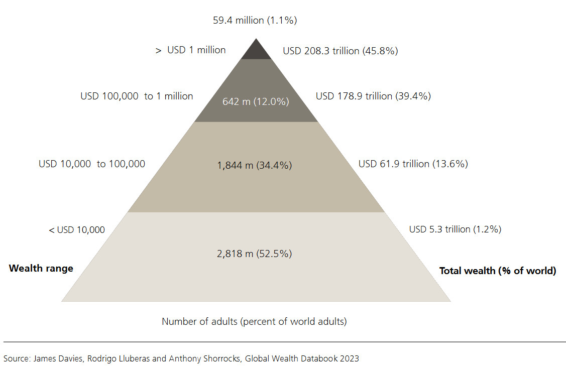 На картинке показана пирамида распределения богатства по миру. 1,1% взрослого населения (59,4 млн. человек) — долларовые миллионеры. 12% населения (642 млн. человек) имеют капитал от 100 тыс. долларов до 1 млн. долларов. 34,4% населения (1,844 млрд. человек) имеют капитал от 10 тыс. долларов до 100 тыс. долларов. Наибольшая часть населения — 52,5% — имеют капитал меньше 10 тыс. долларов.