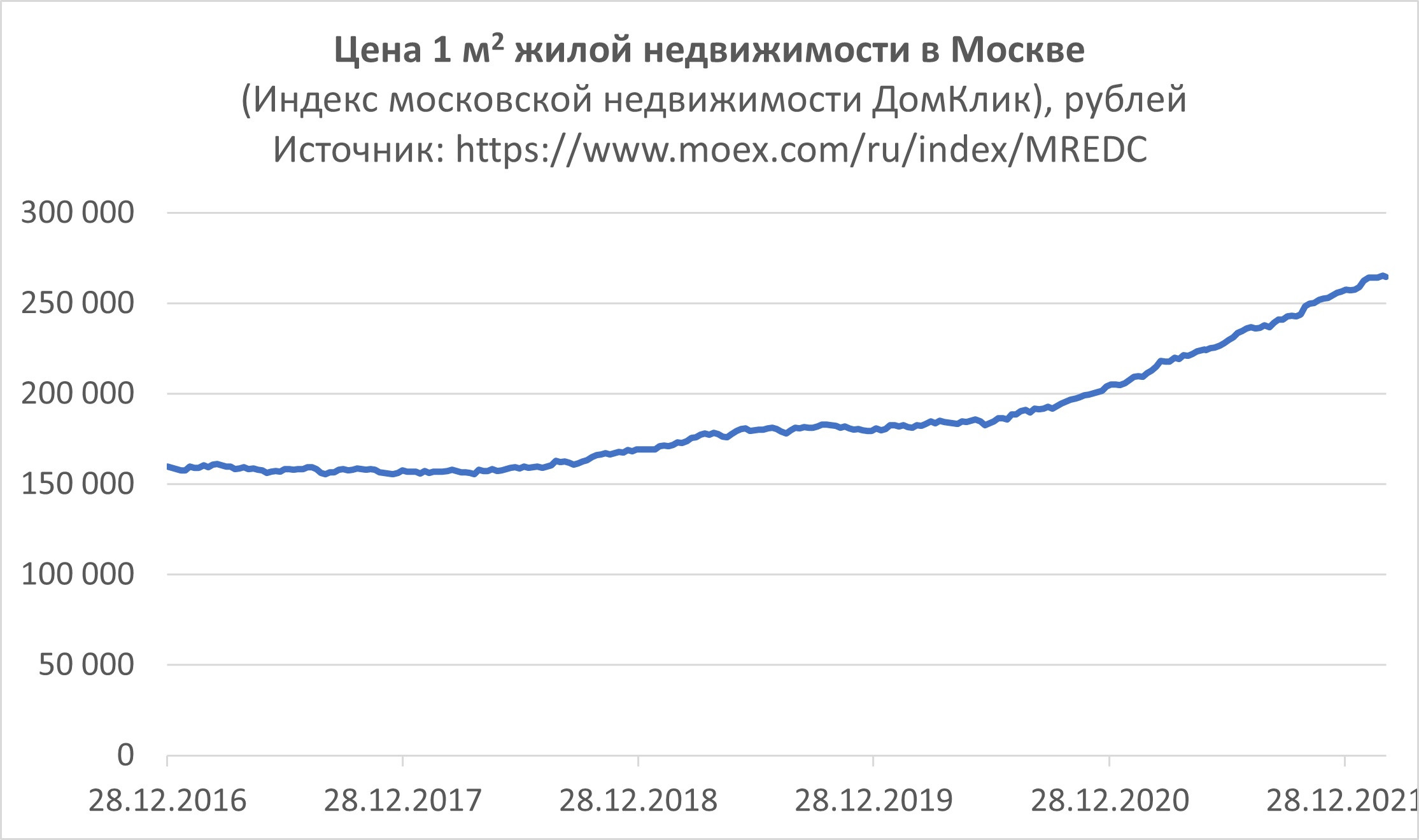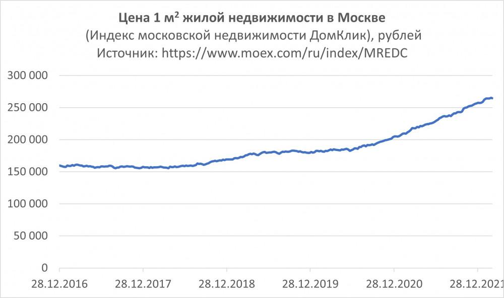 Московская Биржа и Сбербанк совместно рассчитывают индекс стоимости квадратного метра жилой недвижимости в Москве (код индекса MREDC). Последняя актуальная цифра (16 марта 2022) — 268 тыс. за квадратный метр. Индекс рассчитывается на основе реальных ипотечных сделок Сбербанка, то есть хорошо отражает рынок жилой недвижимости в Москве. За последние 5 лет индекс вырос со 160 тыс. до 268 тыс. за квадратный метр, то есть среднегодовой рост 10%.