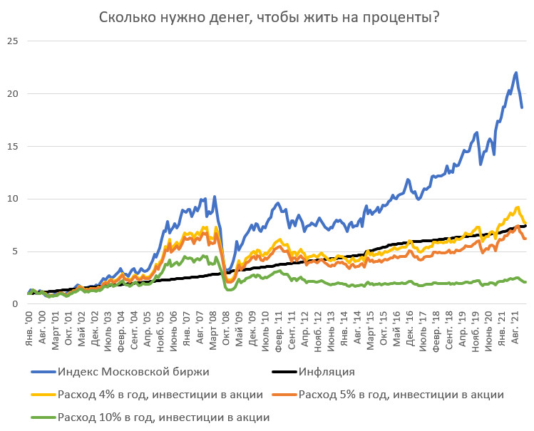 Если ваша цель иметь пассивный доход от инвестиций при условии, чтобы основной капитал сохранял покупательную способность, безопасная норма трат — не более 5% в год. Если нет цели сохранить основной капитал, то норму трат можно увеличивать и приближать к 10%.