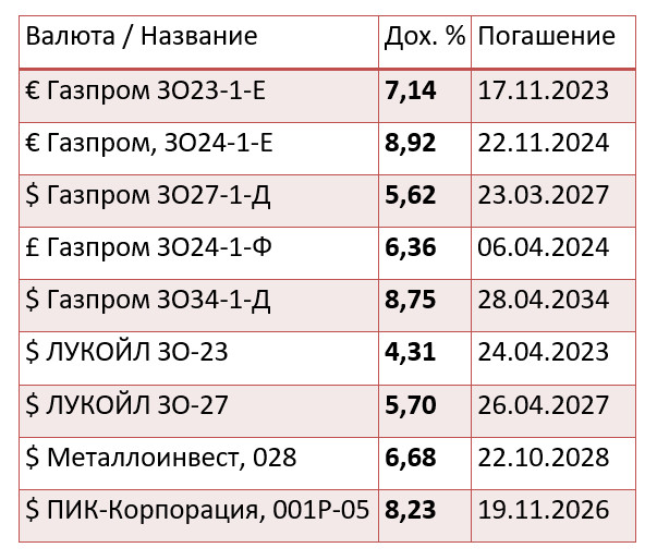 Да, после замещения они свободно торгуются на Московской бирже. Можно купить замещающие облигации Газпрома, ЛУКОЙЛа, ПИК и других компаний с доходностью до 9% в долларах, евро, фунтах стерлингов. Выплата купонов и погашение будут по курсу валюты Банка России на дату выплаты.