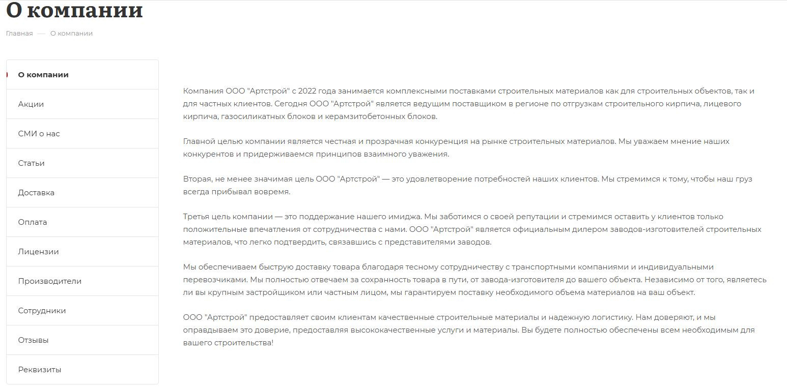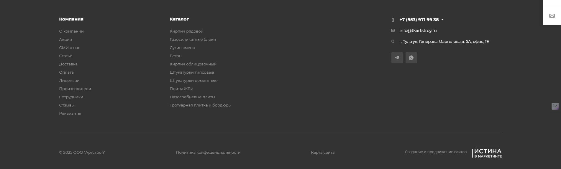 До: После: ✅ Оптимизировали меню: До: После: Создали современный дизайн, который сохранил узнаваемость бренда и транслирует надёжность. Ключевые решения: 🎨 Цветовая гамма: серый (надёжность) + красный акцент для кнопок. 🖼️ Улучшили структуру каталога: До: После: 📦 Изменили карточки товара: До: После: Почему это работает: когда покупатель не видит статус товара и информацию о доставке, он уходит с сайта. Мы закрыли эти возражения прямо в карточке товара. Сайт разработали на 1С-Битрикс — гибкой CMS для самостоятельного управления контентом. Что реализовали: ✅ Удобная административная панель: ✅ Оптимизировали структуру ссылок (ЧПУ): Раньше: /catalog.php?id=1234Теперь: /catalog/kirpich/oblitsovochnyy-kirpich/ Человекопонятные URL повышают доверие и улучшают позиции в поисковой выдаче на 20-30%. ✅ Провели базовую SEO-оптимизацию: ✅ Разработали информационные разделы: Современный сайт с удобной навигацией: Удобная административная панель: SEO-оптимизация: Инструменты для конверсии: «Наша компания «Артстрой» занимается поставками строительных материалов. Мы обратились к «Истине в маркетинге» для создания нового сайта. Главной целью было создание удобного ресурса для наших клиентов. Команда работает профессионально, с чёткими этапами и оперативным взаимодействием. «Истина» учла все пожелания, а самое главное — сделала качественный сайт всего за 2 недели! Новый сайт удобен в использовании, наглядно представляет продукцию и соответствует всем требованиям. Всем рекомендуем сотрудничество с данной компанией!". Евгений Лукашин, учредитель ООО «Артстрой». ✅ Чёткое планирование и понимание задач клиента. Мы не просто «нарисовали красивый дизайн», а решили конкретные проблемы: сложное администрирование, неудобный каталог, устаревший интерфейс. ✅ Фокус на удобство владельца. Клиент получил инструмент для самостоятельного управления. Это экономит время и деньги — не нужно обращаться к разработчикам для простых правок. ✅ SEO-оптимизация с первого дня. Сайт изначально создан с учётом требований поисковых систем — это даёт фору в продвижении. Если ваш сайт: ...значит, он тормозит рост вашего бизнеса. Что делать:
