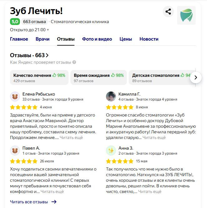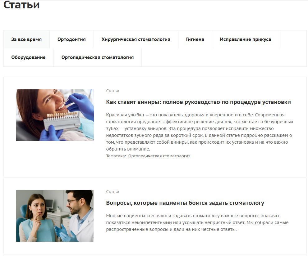 После запуска сайта мы сразу приступили к комплексному SEO-продвижению. Цель — вывести клинику в ТОП поисковых систем и обеспечить стабильный поток пациентов из органического поиска. Первым делом мы провели глубокую внутреннюю оптимизацию: 🔧 Техническая оптимизация: Подготовили ТЗ на уникализацию шаблона — сайт должен был отличаться от конкурентов не только визуально, но и на уровне кода. Разработали индивидуальные блоки для ключевых страниц. Настроили корректную структуру URL, файлы robots.txt и sitemap.xml. Улучшили скорость загрузки сайта. 👨⚕️ Детальная проработка карточек врачей: Каждый специалист получил полноценную страницу с описанием опыта, квалификации, специализации и отзывами пациентов. Добавили фото и информацию об образовании. 🦷 Глубокая проработка страниц услуг: Написали подробные, экспертные описания каждой услуги. Добавили разделы: показания, противопоказания, этапы лечения, стоимость, FAQ. Внедрили LSI-ключи и семантически связанные запросы для расширения охвата. Оптимизировали заголовки, мета-теги, alt-теги изображений. Одна из ключевых стратегий — создание экспертного контента, который решает реальные проблемы пациентов. 📝 Что мы делали: Написали серию экспертных статей: Каждая статья основана на реальных вопросах пациентов, содержит экспертную информацию от врачей клиники, оптимизирована под поисковые запросы. Результат: статьи начали приводить значительный органический трафик уже через несколько недель после публикации. Пациенты находили информацию, убеждались в экспертности клиники и записывались на приём. Параллельно с работой над контентом мы занялись внешней оптимизацией — важнейшим фактором ранжирования. 🔗 Что входило в работу: Закупка вечных ссылок: Разместили ссылки на авторитетных медицинских порталах, справочниках клиник, тематических сайтах. Выбирали только качественные доноры с хорошей репутацией. Публикация статей на сторонних ресурсах: Написали и разместили экспертные материалы на популярных площадках: медицинские блоги, порталы, городские СМИ. Каждая статья содержала естественное упоминание клиники и ссылку на сайт. Работа с отзывами: Вели клинику в Яндекс.Бизнес и 2GIS. Отвечали на каждый отзыв — это повышает доверие и улучшает позиции в локальном поиске. Обновляли контент для поддержания актуальности карточек. Результат: авторитет сайта значительно вырос. Позиции по целевым запросам начали расти, трафик увеличился в несколько раз. За год работы мы достигли впечатляющих результатов: 📈 Рост трафика в 8 раз: с 700 посетителей в месяц до 5700+ 🔝 Позиции в ТОП: запросы по тематике имплантации, терапии, ортопедической стоматологии и хирургии — позиции в ТОП-5 по Москве. 📞 Стабильный поток заявок: ежедневные записи на приём через сайт. 💰 Снижение стоимости привлечения: один пациент из органического поиска обходится в 5-7 раз дешевле, чем из контекстной рекламы. Мы не останавливаемся на достигнутом. Сейчас вместе с клиникой работаем над редизайном сайта — догоняем актуальные тренды и подстраиваемся под меняющиеся вкусы аудитории. «Работаем уже скоро год вместе. Ребята разработали и продвигают наш сайт. Нравится оперативность реагирования на наши запросы, также очень крутой у них копирайтинг, профессиональные статьи пишут шикарно. И ни разу за время работы я не слышал что что-то невоз