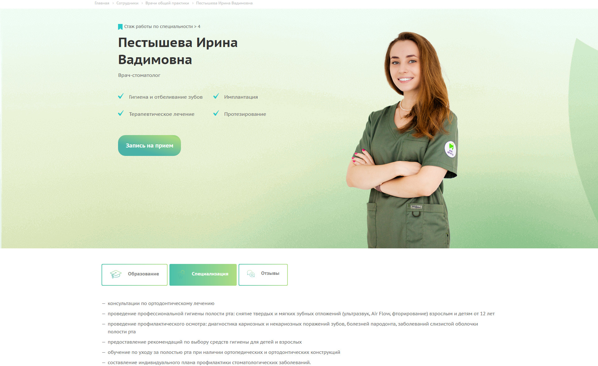 За 26 дней мы создали современный сайт с понятной структурой: главная страница с формой записи, страницы услуг и специалистов, раздел статей, контакты. Разработали адаптивный дизайн в спокойных медицинских оттенках с яркими кнопками записи. Написали уникальные тексты для каждой услуги и карточки врачей с опытом и квалификацией.
