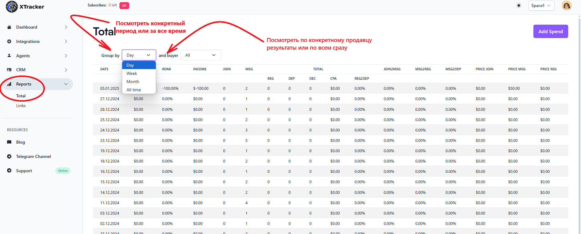 Статистика по периодам и по ссылкам доступна в разделе «Reports»: