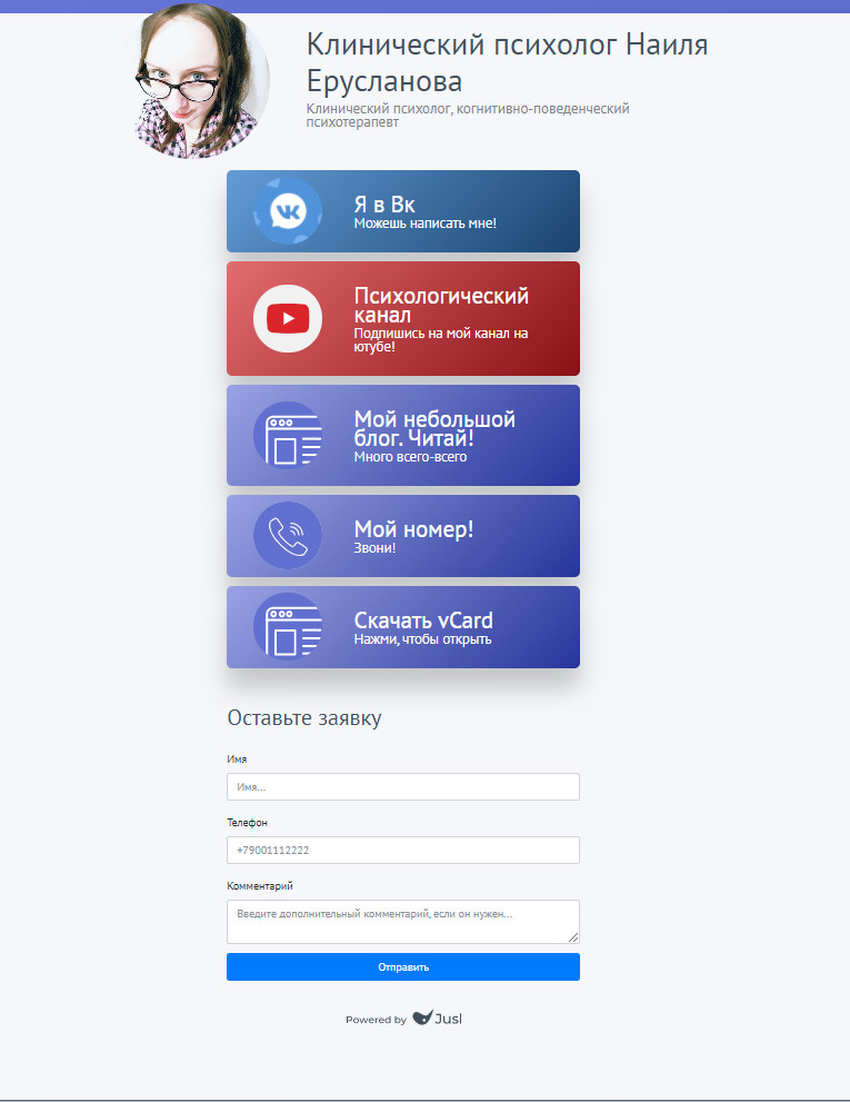 Как я уже написала, бумажные или пластиковые визитки нынче выполняют лишь роль имиджевую. Так же, порой, важные контактные данные указывают на вывесках кабинетов или офисов. Поэтому имеет смысл использовать на вышеизложенных носителях информации так называемый динамический QR -код, отсканировав который, ваш клиент попадет на страницу электронной визитки и сохранит контакты в свой телефон или свяжется с вами. Это самые важные функции. Можно так же использовать дополнительные возможности для электронных визиток — такие, как веб-аналитика , сбор баз данных . Это нужно для того чтобы иметь возможность еще как-то взаимодействовать с собранной аудиторией, например, делать рассылки. Веб-аналитика нужна, к примеру, если вы будете настраивать таргетинговую рекламу в Фейсбуке или Вк, чтобы «старгетироваться» на аналогичную аудиторию. Для осуществления этих функций к электронной визитке или лендингу подключают метрики: Фейсбук Пиксель, Яндекс Метрику, Пиксель Вк. Чтобы создать электронную визитку, воспользуемся специальным сервисом Jusl. И так, приступим. 1. Переходим в JuslBot и нажимаем на «Добавить ссылку», далее — на «Добавить визитку» . Потом отправляем наш первый наш контакт — это может быть ссылка на источник или номер телефона. Я отправлю номер телефона. 2. Чтобы редактировать и добавлять кнопки-ссылки и на другую контактную информацию в цифровую визитку, а так же включить функцию vCard и Qr-vCard (это штуки, которые автоматически сохранят ваши контакты на телефон клиенту), нажимаем на «Кнопки». Соответственно, чтобы добавить vCard , я нажму на «Добавить vCard » , а чтобы добавить кнопки-ссылки на другие источники я воспользуюсь функцией «Добавить кнопку». Я отправлю ссылки на свою страницу в Вк, Ютуб-канал и на свой блог. 3. Чтобы отредактировать название и описание каждой добавленной кнопки-ссылки, нужно в том же меню «Кнопки» нажать на добавленный контакт и использовать функции «Изменить название» и «Изменить описание». 1. Добавим заголовок (кому принадлежит визитка/название компании). Нажимаем «Изменить заголовок» и вводим наименование. 2. Добавим минимальную информацию о владельце. Нажмем «Описание» . Пишем кратко о себе или о своей деятельности. 3. Добавим логотип (или персональное фото). Для этого я нажму «Лого» и отправлю свою фотографию. 4.Чтобы сделать саму ссылку красивой, используем кнопку «Изменить вид ссылки». С помощью формы обратной связи, любой человек, оказавшийся на странице вашей визитки, сможет отправить вам заявку на консультацию, а вы автоматически получите её прямо в бота. Для того чтобы добавить форму заявки, нажмите на кнопку «Формы» и выберите удобный формат. Я выберу для своей визитки форму, где человеку необходимо будет оставить свой номер телефона, чтобы я потом смогла ему позвонить. В целом, визитка готова. Чтобы проверить, не сделали ли мы ошибок, нажмем на «Предпросмотр» — проверим. Но даже после публикации, мы всегда сможем все поменять и добавить другие функции. После проверки, если все в порядке, нажмем кнопку «Опубликовать» . Вот такая у меня получилась цифровая визитка: http://l.jusl.ru/NellyFreud Теперь ссылку на нашу визитку-лендинг мы можем разместить где угодно, лить на нее рекламу и получать заявки. Так же мы можем распечатать бумажные визитки с Qr -кодами, которые приведут клиента на эту страницу, и он сможет автоматичес