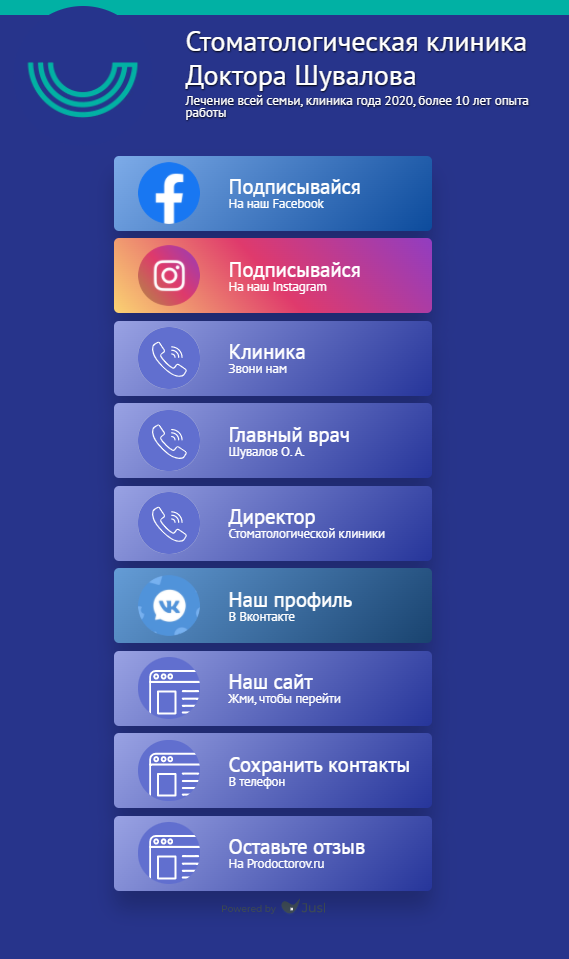 У некоторых других стоматологов это была небольшая круглая nfc-визитка 3 см. в диаметре, приклеенная к чехлу телефона. Поэтому я решила поинтересоваться, почему стоматологи выбирали в качестве личной визитки именно nfc-визитку, и вот что я узнала. В неформальной беседе доктора пояснили мне, что помимо каких-то имиджевых и прямых функций, которые в общем-то выполнит любая более-менее красиво оформленная визитка, современная цифровая визитка делает куда больше: Некоторые стоматологи называли в качестве важной составляющей электронной визитки — это возможность клиенту перевести оплату доктору на личный счет. Nfc-визитку купить можно в принципе у разных производителей. Есть как очень дешевые варианты от 500 рублей, но там нельзя поменять дизайн, на страницу можно добавить лишь соц.сети и телефон. Так же есть очень дорогие производители, у которых стоимость визиток начинается от 9 тысяч рублейи выше, причем непонятно из чего складывается такая цена. По моему мнению, самый современный и обоснованный по цене вариант — это визитки от компанииJusl. У них цены визиток начинаются от 1499 рублей за штуку. В этих визитках есть все функции, о которых я писала выше, а так же можно менять дизайн страницы на свое усмотрение, и можно заказать устройство с индивидуальным логотипом.