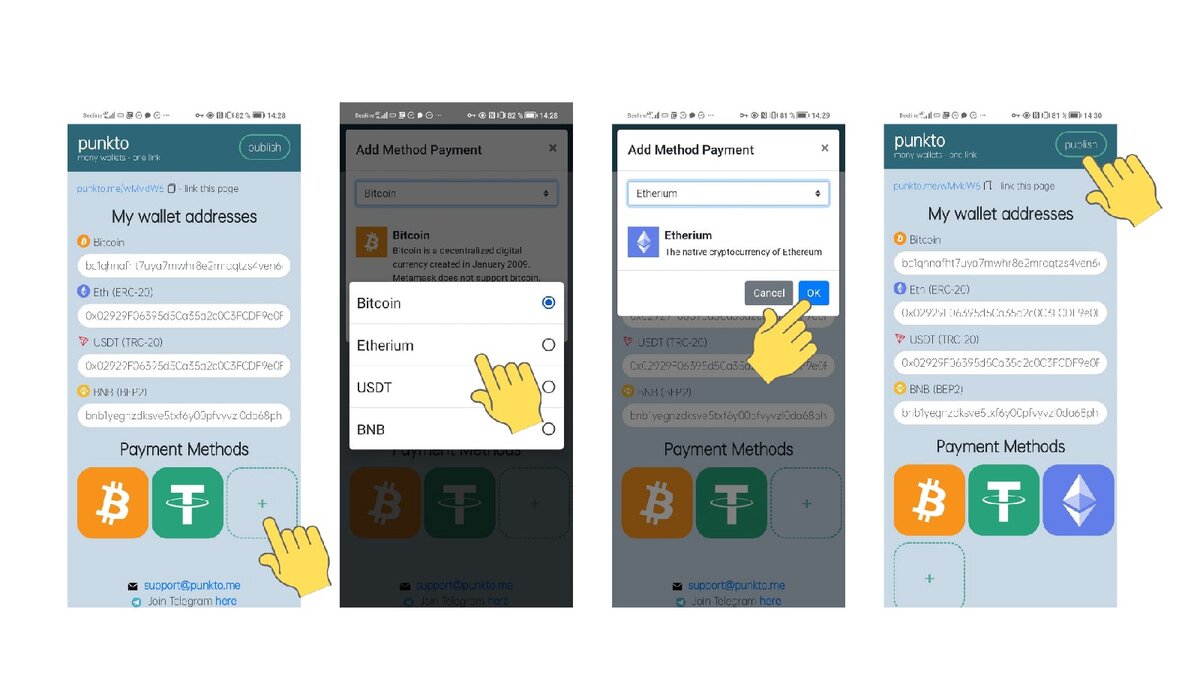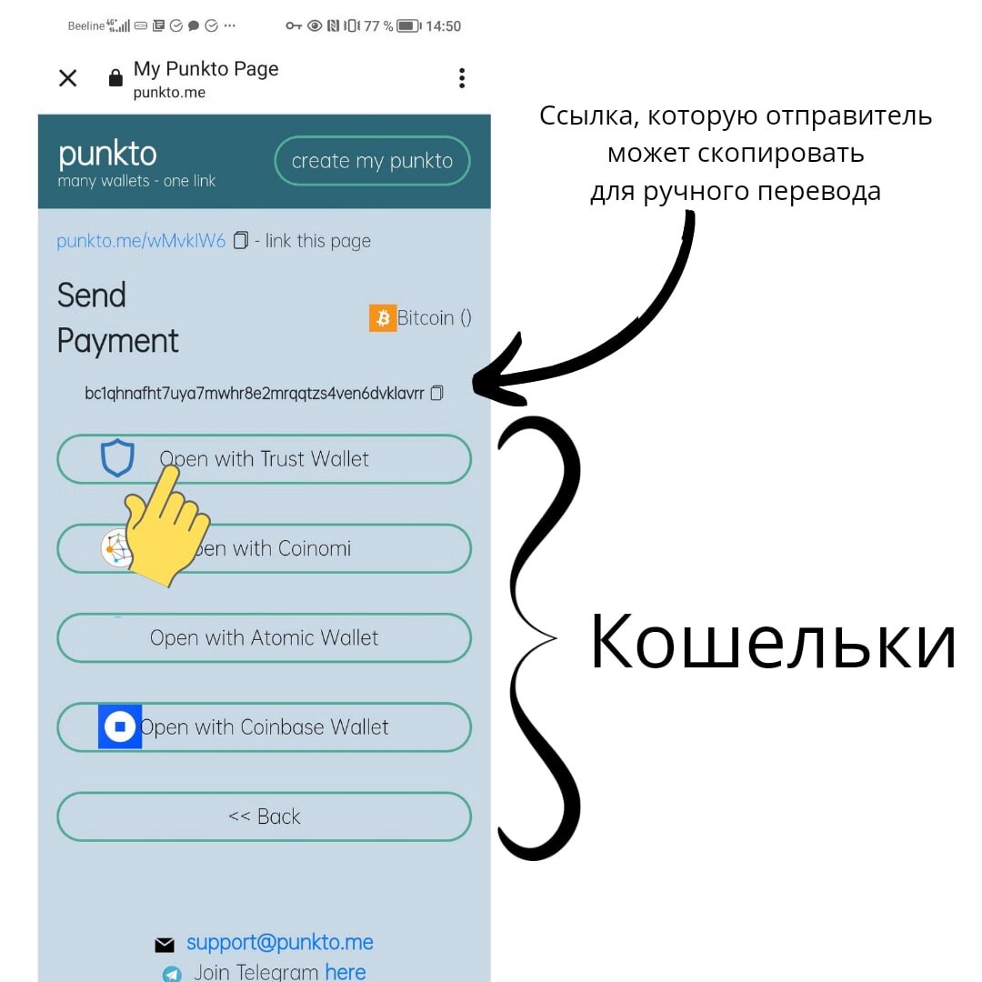Учитывая эти нюансы, лучше всего создать универсальную ссылку-диплинк для приема донатов в криптовалюте, где есть возможность переводить/получать разную валюту с разных кошельков.
