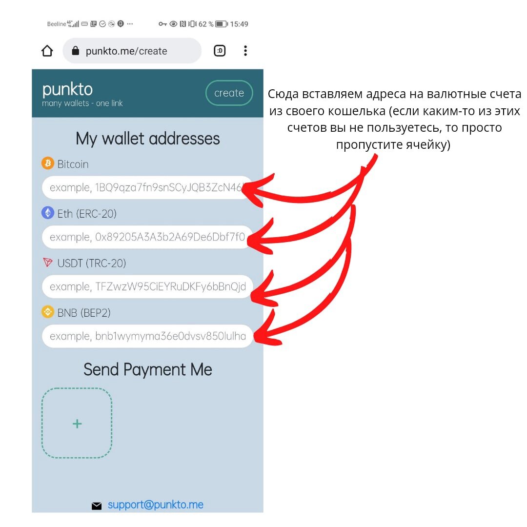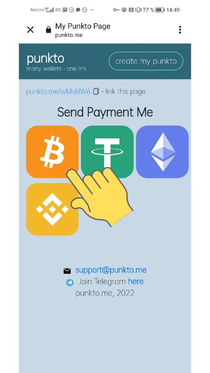 1. Переходим на сайт сервиса и нажимаем кнопку «Create My Punkto». 2. В разделе "My wallet addresses"мы видим адресные строки, куда вставим адрес на тот или иной криптовалютный счет. Адрес на каждый валютный счет мы должны скопировать со своего кошелька, которым пользуемся, и вставить в соответствующую строку (если мы какой-то валютой не пользуемся, то просто не заполняем эти конкретные строки). Для демонстрации я заполнила все адресные строки. 3. В разделе «Send Payment Me» я указываю, какую криптовалюту я принимаю (не удивляйтесь, ведь на один и тот же адрес можно переводить разную валюту, поэтому указать необходимо): нажимаю на квадрат с крестом, и система предлагает мне указать валюту, жму на выпадающее окно со стрелочками и выбираю нужную валюту, далее, нажимаю «Ок». 4. В адресную строку вставляю адрес своей почты, а затем жму «Accept». Теперь у нас есть универсальная ссылка, которую мы можем отправить человеку, желающему задонатить нам криптовалюты, и обязательно размещаем её на своих ресурсах. 5. Тем временем, на почту мне придет ссылка, перейдя через которую, я смогу отредактировать свою страницу с кошельками — удалить неактуальную информацию или добавить актуальную. И так, универсальную ссылку мы создали и разместили её на Тик Токе, а давайте теперь посмотрим, что увидит человек, желающий перевести нам вам валюту, перейдя по ней. 1. Пользователь, перейдя по вашей универсальной ссылке, в разделе «My wallet addresses» увидит страницу с логотипами валюты, которую вы принимаете. Он просто нажимает на значок валюты, которую хочет перевести вам. 2. Нажав на соответствующую кнопку, он увидит вашу ссылку на конкретную валюту, которую он может скопировать и сам в ручную с помощью нее осуществить перевод, а также он увидит список кошельков, через которые можно осуществить перевод автоматически, выбрав тот, которым пользуется он сам. 3. После того, как отправитель нажмет на кнопку кошелька, он попадет в свой кошелек и осуществит перевод, указав необходимую сумму валюты. Для того чтобы начать собирать донаты в Тик Токе в криптовалюте, необходимо: 1. Подключить один из криптовалютных кошельков (например, Trust Wallet, Meta Mask, Atomic Wallet); 2. Создать свою универсальную ссылку-диплинк, ведущую на ваш индивидуальный валютный счет. Создать такую ссылку можно с помощью сервиса Punkto. 3. Разместить ссылку на своих в Тик-Токе.