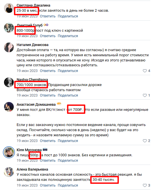 Стоимость текста за час работы Эта методика подсчета намного адекватнее. В приведенном выше примере копирайтер потратит на написание поста в соцсети полчаса, ну час. А коммерческое предложение он будет писать несколько дней, если учитывать все затраченное время: изучение бизнеса, ЦА, конкурентов, созвон с клиентом, еще созвон с клиентом... Поэтому копирайтер высчитывает примерную стоимость часа работы и называет сумму исходя из затраченного времени. Это честно. Да и заказчикам хорошо: у нас есть клиенты, которые специально просят работать по такой методике, бухгалтерии удобно, всем понятно. Стоимость единицы контента Мы в агентстве используем чаще всего именно такой подход. Когда только начинали, проанализировали цены по рынку и установили средние расценки. Например, 1 статья у нас в агентстве средним объемом 6-8 000 знаков стоит в среднем 15 000 р. Если тема сложная — дороже. Если объем нужен больше — дороже. Если процесс работы предполагает постоянные созвоны с экспертами, большой пакет документов, сложный менеджмент — дороже. Все эти нюансы оговариваются индивидуально, прописываются в коммерческом предложении, а потом и в договоре. В итоге вы всегда понимаете, за что платите. Посмотрим, сколько стоит написать текст разных форматов. Понятно, что рынок контент-маркетинга очень широк, даже на бирже можно встретить заказ на 100 рублей, а можно и на 10 000. Одни агентства берут 10 000 за статью, другие 50 (тысяч :). Будем рассматривать некий усредненный вариант по рынку, исходя из нашего опыта. Сколько стоит статья в блог Сначала посмотрим расценки на бирже копирайтинга. Не будем рассматривать откровенный шлак — для биржи хорошей считается стоимость 150 рублей и выше.Вот заказ на статью 3 000 знаков стоимостью 200 рублей за 1 000 символов. Это небольшая статья-инструкция, она вполне может украсить блог по маркетингу. Обратите внимание на звезды — заказчик может выбрать специалиста с высоким трехзвездочным уровнем. . Перейдем к авторам-фрилансерам. Сколько стоит заказать статью у хорошего копирайтера, который имеет достаточно опыта, чтобы работать не на бирже, а самостоятельно? По нашему опыту, это стоит в среднем 3-5 000 рублей за текст. Авторы с именем и богатым портфолио могут брать и по 8, и по 10, и по 15 000 за статью. Часто копирайтеры ставят в портфолио стоимость услуги за час: При работе с авторами есть нюанс: они не сдадут статью под ключ. Они просто напишут текст, а его надо редактировать, SEO-оптимизировать, исправлять ошибки, публиковать на сайте и самое главное — делать его продающим. Если у вас нет такого специалиста, задумайтесь, кто это будет делать, или обратитесь в агентство — там сделают под ключ. В этом главный плюс агентства — вы даете задачу и не думаете больше ни о чем, специалисты все сделают сами, вам останется получать профит. Вот что входит у нас в агентстве в подготовку 1 статьи среднего объема на несложную тему: Уровень и качество материалов вы видите, читая эту статью :) Сколько стоит пост в соцсети Здесь делать градацию по подрядчикам особо не имеет смысла. На бирже в основном заказы на статьи, посты видела редко и по каким-то смешным ценам 100 рублей за пост. Фрилансеры берут в среднем 500-1 000 рублей за 1 пост — в паблике по копирайтингу нашла занятное обсуждение: Сколько стоит пост в агентстве — у нас от 3 000 рублей. Опять же в эту услугу входи