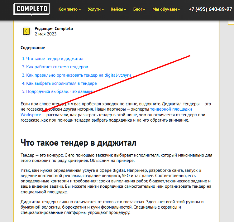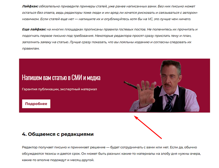 Кнопка есть на всех страницах сайта в одном и том же месте: обычно это правый верхний угол. Часто кнопку дублируют в футере для того, чтобы посетитель, доставший до конца страницы — например, при прочтении статьи — тоже на нее наткнулся. На нашем сайте есть отдельная скользящая кнопка, которая всегда на виду. При скроллинге она не движется, а словно приклеена к нижнему левому углу экрана. При нажатии на кнопку появляется форма для связи: А вот как это реализовано на сайте нашего клиента — агентства NRP agency: Лид-форма — один из самых работающих инструментов. Ее цель — собрать контакты, с которыми потом можно работать: прогревать их, отправлять предложения, коммуницировать. У нас на сайте лид-форма висит в футере сайта: Еще вариант в футере: А здесь лид-форма в конце статьи в блоге: Продающее заключение вообще работает очень просто и в лоб: публикуем статью наподобие «Как написать кейс», а в конце прямо пишем — «хотите крутой кейс — пишите нам или заполняйте форму». Простенько и со вкусом: к этому времени читатель прогреется и убедится в нашей экспертизе. Также формы могут использоваться в виде врезок в статьи и вести на посадочные страницы услуг — как у нас на сайте: Пример на сайте нашего заказчика: Самый главный секрет лид-форм — они не должны быть громоздкими и неудобными для пользователя. Уж простите, это мы заинтересованы в сборе контактов — так облегчите этот сбор максимально. Поставьте себя на место клиента — неужели бы вы стали заполнять 10 полей мелким шрифтом? Конечно, нет, проще закрыть сайт и найти другой, более удобный. Ох, как же я люблю виджеты. Они конвертят лучше стационарных элементов. Виджет — это всегда что-то динамическое и двигающееся, а значит, человеческое зрение реагирует на них автоматически — так оно устроено. Виджетов много: Мы на своем сайте используем попап: А некоторое время назад использовали квиз. Квиз работал неплохо: лиды шли, но закрыть в продажу их не удавалось. Поэтому отказались от этого инструмента. Всплывающее окно запустили недавно как часть большой воронки на сайте, сейчас он работает в тестовом режиме. Воронка допиливается, там посмотрим. Лидмагнит — бесплатное, но ценное предложение на сайте. Ну как бесплатное: в обмен нужно оставить адрес электронной почты. В качестве лидмагнита может быть все что угодно: Главное — чтобы лид-магнит был релевантен аудитории. Вот как это выглядит на сайте: При нажатии на кнопку появляется форма: Затем с собранными контактами нужно работать: прогревать, отправлять релевантные предложения. Эти лиды уже теплые, раз оставили свои данные — а значит, и конверсия в покупку должна быть выше. Кнопки СТА, формы заказов, виджеты, лидмагниты — все это прекрасно работает на собственном сайте, где вы барин и хозяин. Но что делать, если вы публикуетесь в СМИ, на Дзене или VC, где свои правила, своя верстка, а редакторы внимательно бдят, чтобы вы не дай Бог не прорекламировали свои услуги? Нам остается старый добрый линкбилдинг. Ссылка с трастового хорошего сайта — плюс в карму SEO и весомый шанс, что человек пройдет по ссылке и таки оставит вожделенные контакты — станет лидом. Обычно даже СМИ разрешают поставить ссылку на сайт — а нам того и надо. Хорошая площадка Completo тоже без проблем разрешила поставить линк, а то и не один: Чаще всего ставят одну ссылку на главную страницу и (ил