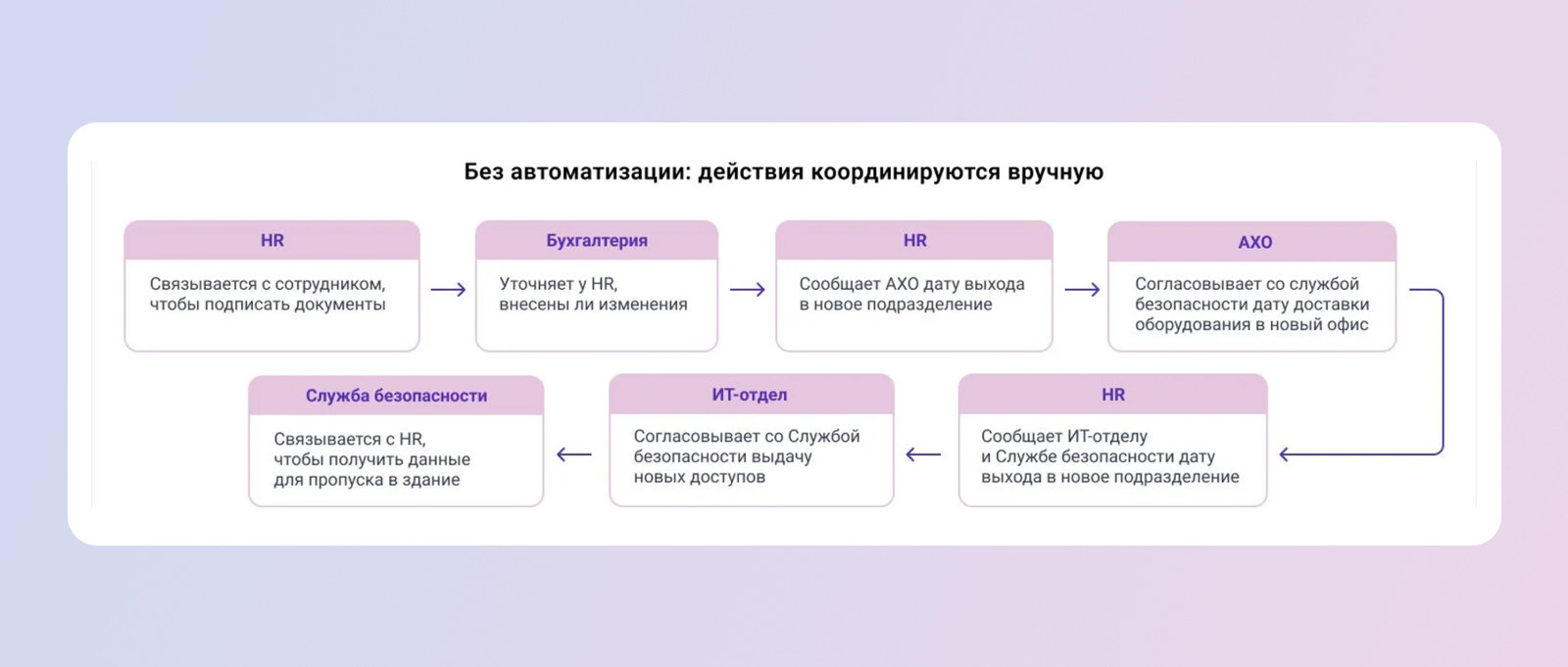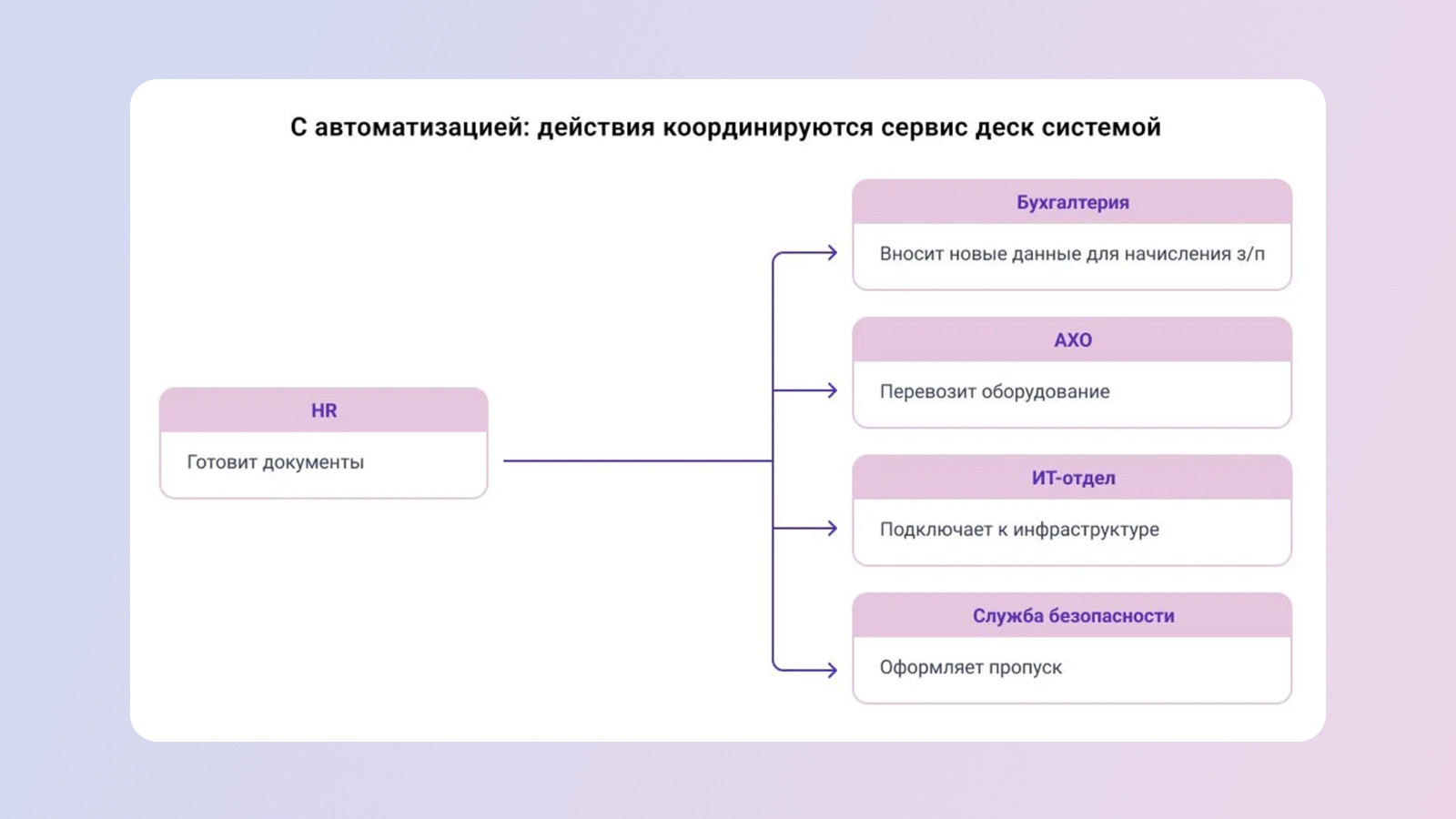 - Улучшение Employee Experience. Автоматизация процессов в АХО или бухгалтерии способствует улучшению внутрикорпоративного сервиса, что положительно влияет на атмосферу в коллективе и качество работы всей команды