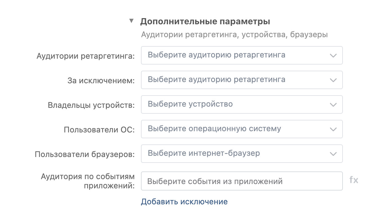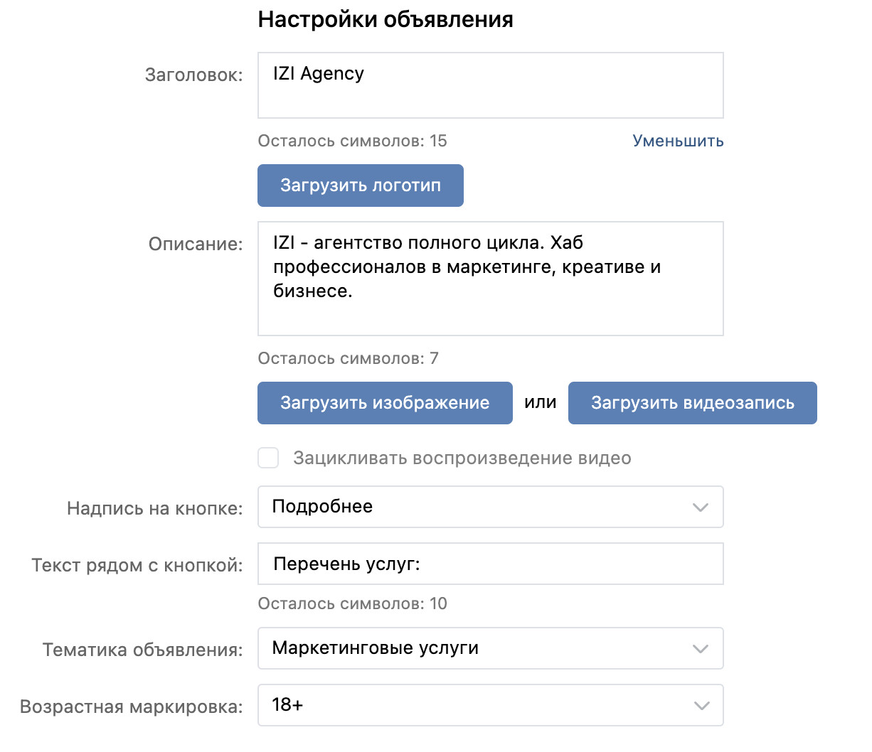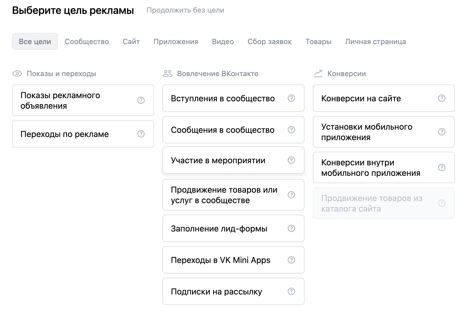 В FB фундаментом кампании были выбранные цели, а в VK они носят больше номинальный характер. Исключение — цель «заполнение лид-формы», там так же как и в фейсбуке. С целями «конверсии на сайте» и «установки мобильных приложений» нам нужно будет установить пиксель VK или интегрировать мобильное приложение через доступные трекеры.