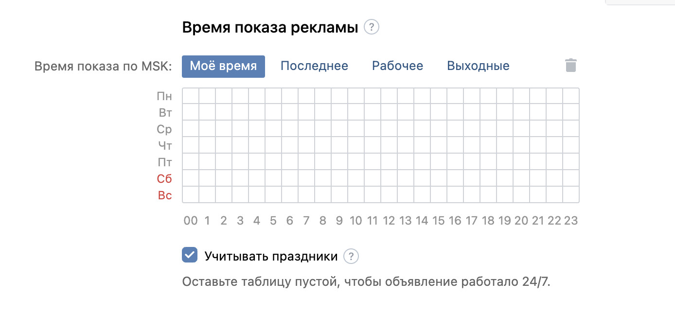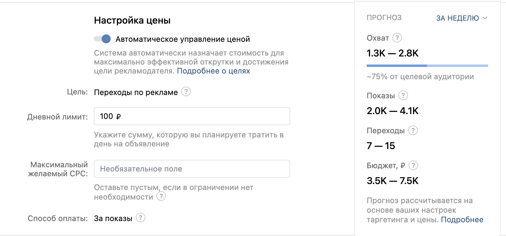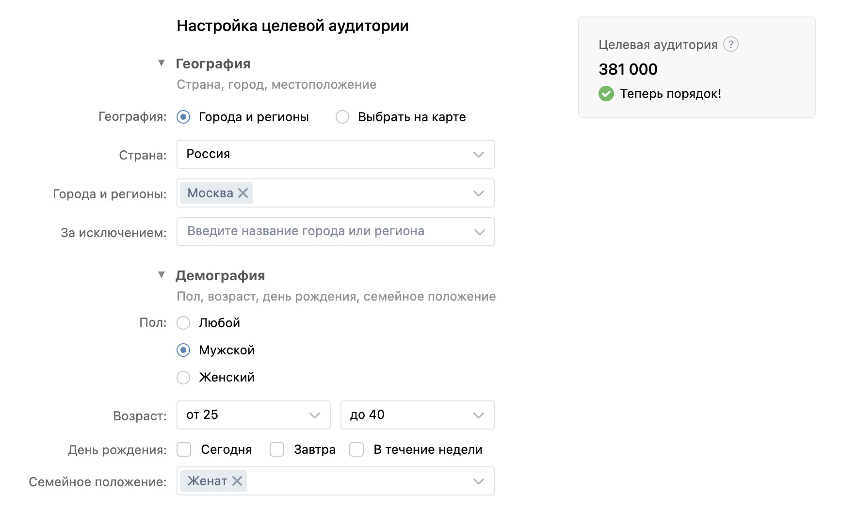 1.Переходим в создание объявлений 2. Выбираем цель Цели рекламы делятся на три категории: Также есть отдельные подкатегории, к примеру — продвижение товаров, где у вас будет вариант продвигать каталог как и в самом VK, так и за его пределами. Еще вы можете выбрать функцию «Продолжить без цели». Для примера мы выбрали цель «Переходы по рекламе». 3. Выбираем формат креатива Доступность различных форматов зависит от цели продвижения. Здесь есть: тизеры, продвижение больших постов, карусели и т.д. Под каждый конкретный случай можете подобрать то, что вам лучше подойдет. 4. Загружаем креатив Сам креатив в случае с рекламой сайта состоит из: На выходе объявление будет выглядеть так: 5. Переходим к выбору аудитории Здесь важно понимать, что принцип работы с аудиторией кардинально отличается от FB или TikTok Ads, где сужать аудиторию часто не нужно, чтобы не мешать алгоритмам. В VK всю работу придется делать вручную. Если вам позволяет бюджет, или модель бизнеса требует работать с широкими сегментами, то собираем выборку из географии, демографии и набору интересов с ключевыми словами, подписчиков сообществ. Если необходимы более узкие сегменты, то лучше обратиться к работе с парсерами, через которые вы сможете вглубь сегментировать аудиторию. К примеру, собрать активных или новых подписчиков из необходимых сообществ. Собираем нужную нам выборку по гео. Если ваш бизнес локальный, то можно будет выбрать конкретную точку на карте и указать значение расположения объекта на карте для пользователя (живет он там или работает). По демографическим признакам подбор стандартный, как и в других рекламных системах. Но в отличие от FB, таргетинг по семейному положению более точный. Указываем подписчиков или активности в сообществах: В дополнительных настройках можно указать слушателей определенных музыкальных исполнителей или пользователей конкретных приложений. Также, есть таргетинг по ключевым запросам, которые люди вводили в последнее время. По необходимости указываем график показа рекламы: 6. Ставки Здесь на ваш выбор есть автостратегия и ручные ставки по CPM и CPC. При ставке за клик обычно ставится цена, которая при прогнозе бюджета будет покрывать не менее 50% от общей аудитории. Дневной минимальный лимит на одно объявление — 100 рублей. Такой суммы порой бывает достаточно, чтобы проверить эффективность креатива/аудитории. Затем можно масштабироваться. Но без выверенной стратегии лучше не баловаться с таргетом — CPC может скакать в любую сторону. Кое-что про оптимизацию Запустили кампанию и смотрим в Метрику. Отслеживаем эффективность по креативам, просматриваем аудитории дополнительно в системе аналитики и по результатам вносим корректировки как и в сегменты ЦА, так и в промо-материалы. Смотреть и анализировать придется часто и вглубь. Основная задача таргетолога на старте — найти лучшую связку таргетинг-креатив. Подытог Тема таргетинга во Вконтакте очень объемна. Придется много времени потратить на привыкание к слабым алгоритмам после Ads Manager. В остальном, тестируйте разные форматы объявлений, креативы и аудитории. Работайте с узкими сегментами, и старайтесь транслировать для них максимально релевантные сообщения. А мы в последующих материалах мы будем подробно разбирать каждый этап работы с таргетированной рекламой в VK, и постараемся охватить 