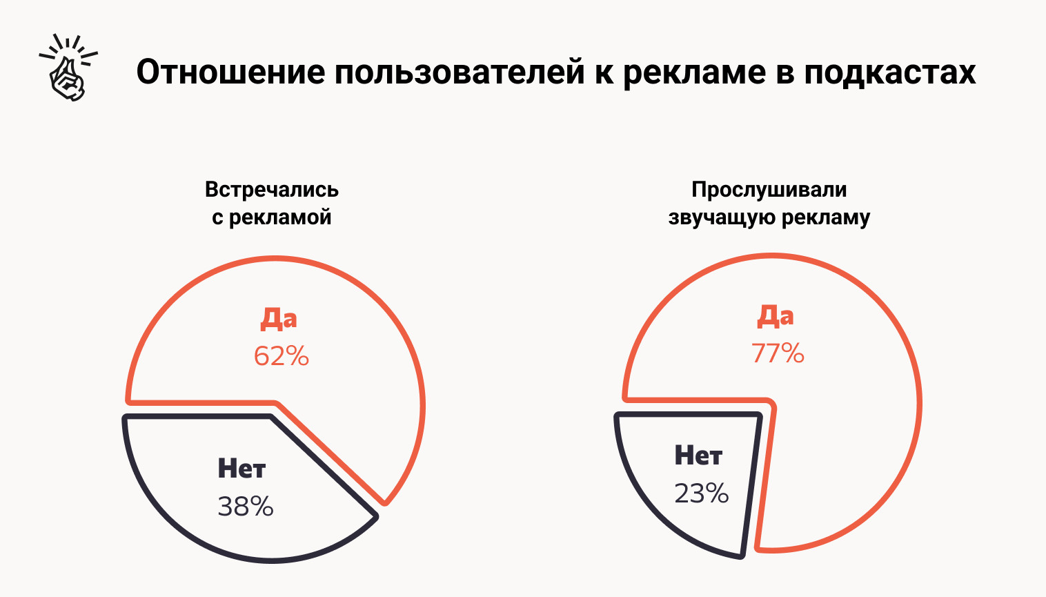 Еще немного цифр: вернемся к исследованию «Лайфхакера» — 62% респондентов встречали рекламу в подкастах, из них: