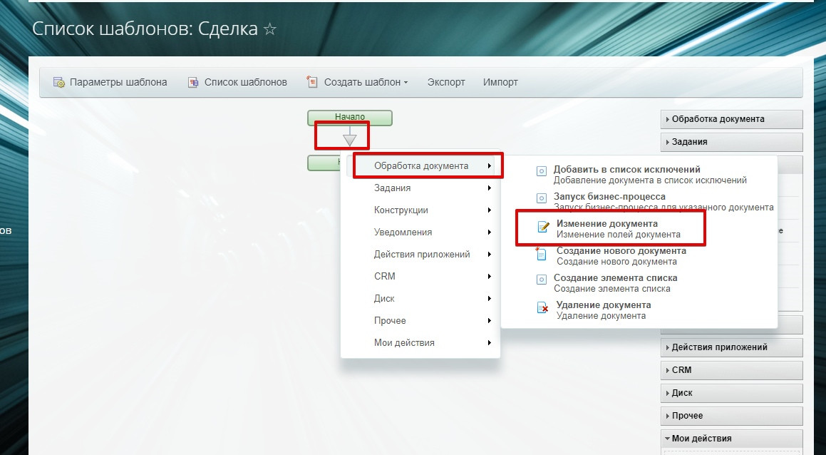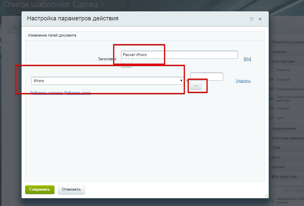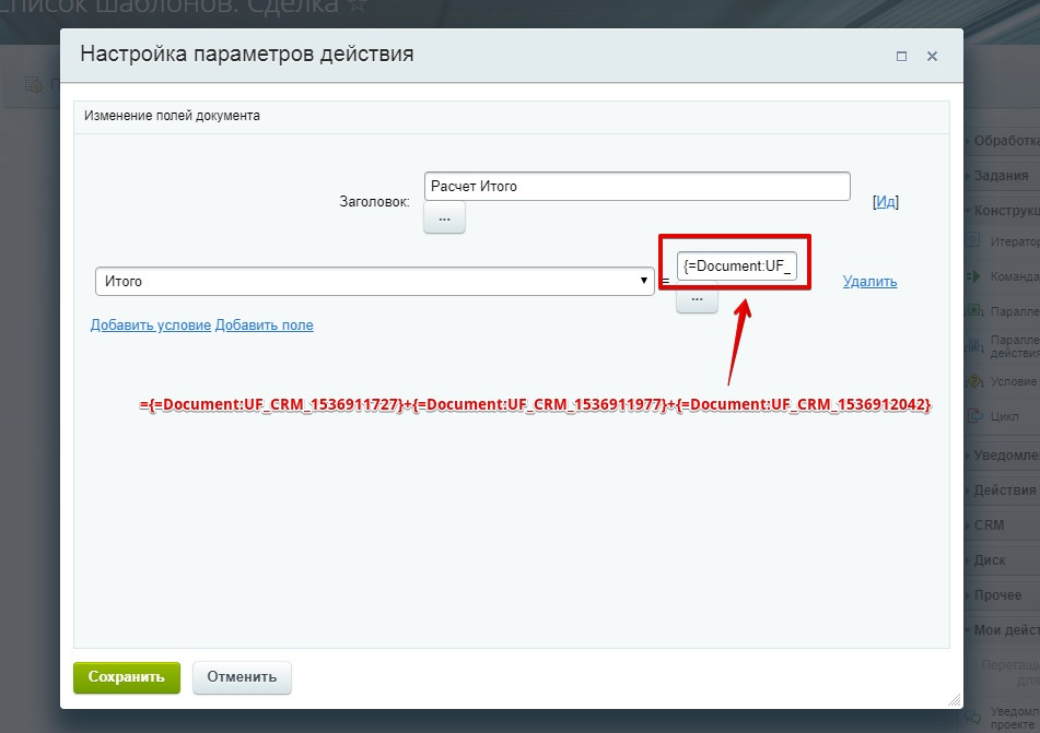 После того, как подготовительные работы были сделаны, то приступаем к настройке бизнес-процесса: в уже знакомом нам разделе настроек выбираем Роботы и бизнес-процессы — Бизнес-процессы и нажимаем добавить шаблон в разделе сделок Заполнив основные параметры шаблона приступаем к созданию действия, которое будет считать поле «Итого» в сделке Далее выбираем действие «Изменение документа», заполняем заголовок по смыслу, выбираем поле «Итого» из списка. Напротив выбранного поля «Итого» необходимо заполнить саму формулу, используя значения имеющихся полей, для чего вставляем в пустое поле все 3 ID полей «сумма аренды оборудования», «сумма партнеру», «сумма контроля», используя кнопку вставки значений. Между ID проставляем знак сложения. В итоге мы получим (конкретно я получил) формулу вида: ={=Document:UF_CRM_1536911727}+{=Document:UF_CRM_1536911977}+{=Document:UF_CRM_1536912042} Закончив с составлением формулы поля «Итого» и сохранения всех изменений смотрим, как работает БП непосредственно в сделке https://vk.com/video203397253_456239066