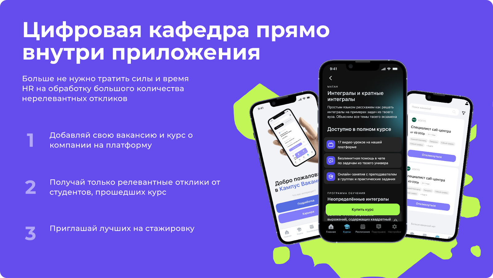 Сервис «Кампус Вакансии» предлагает специализированный метод, который включает целенаправленный поиск кандидатов по городу, вузу, факультету и нужным предметам. Приложение знает, «где искать», поэтому может предоставить необходимую целевую аудиторию для отклика на вакансию. Чтобы гарантировать, что базовый набор знаний стажера будет достаточным, проще выбирать кандидатов среди студентов определенных вузов и программ, чья подготовка соответствует специальности. В базе «Кампус Вакансии» собрано более 4 тысяч резюме начинающих специалистов. А всего в экосистеме «Кампус» насчитывается свыше 250 тысяч активных пользователей, которые могут стать потенциальными кандидатами. Сервис ориентируется не на количество откликов, а на поиск лучших студентов и их интеграцию в штат. Да, для этого на платформе существует Цифровая кафедра, там работодатели могут разместить курсы с информацией о компании и заданиями. Так, во время прохождения мини-курса работодатель видит активность студентов, итоги тестов. Мини-курс состоит из нескольких блоков: hard-skills, необходимых для работы; уроков о корпоративной культуре компании; информации о прохождении собеседования с HR «на одном языке». При этом для студентов курсы кафедры бесплатны. В чем преимущества инструмента: Цифровая кафедра значительно увеличивает шансы на нахождение нужного специалиста, а конверсия выхода в штат оказывается в 9 раз выше по сравнению с традиционными джоб бордами (сервисами для поиска кандидатов и работодателей). В «Кампус Вакансии» средний срок закрытия вакансий составляет 12 дней. В процессе подбора кандидатов сервис может адаптировать параметры поиска: если вакансию не удается закрыть в течение первых десяти дней, сервис расширяет круг поиска, чтобы охватить более широкий круг соискателей. Так, для продвижения вакансий используется реклама в подборке мероприятий внутри приложения, на всплывающих баннерах и сториз. За восемь месяцев с момента запуска «Кампус Вакансии» в мае 2024 года не было ни одного случая, когда сервис не смог закрыть вакансию. Например, для российской рекрутинговой компании Marksman сервис всего за шесть дней без дополнительного таргета смог собрать 12 откликов, которые превратились в три вышедших кандидата на вакансии HR-стажеров. «Кампус Вакансии» запустился в мае 2024 года, а уже в декабре на платформе было опубликовано 150 вакансий. В среднем каждая компания после регистрации публикует по семь вакансий. Сегодня сервис предлагает студентам full-time-работу, стажировки и подработки с гибким графиком. Прежде всего, «Кампус Вакансии» планирует улучшать системы предварительного онбординга студентов в компании, разрабатывая метод гибкого погружения в специальность совместно с работодателем. Такой подход реализуется в рамках Цифровой кафедры. Она сочетает функции HRTech и EdTech и формирует целевую аудиторию для каждой компании. Сейчас вакансии ориентированы на определенные параметры студентов, однако в будущем сервис будет принимать во внимание не только факультет и предметы, но и индивидуальные интересы студентов. Это позволит точнее настраивать продвижение мини-курсов на Кафедре за счет более глубокого анализа профилей в приложении. До конца лета сервис представит полноценный личный кабинет, где работодатели смогут настраивать вакансии, рекламные б
