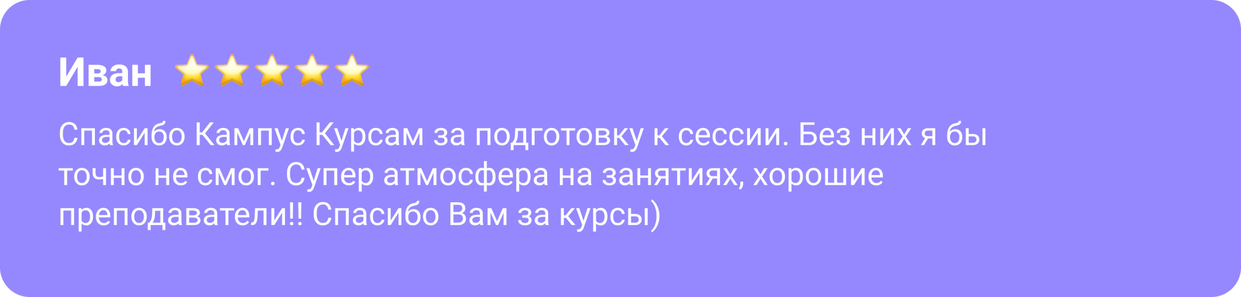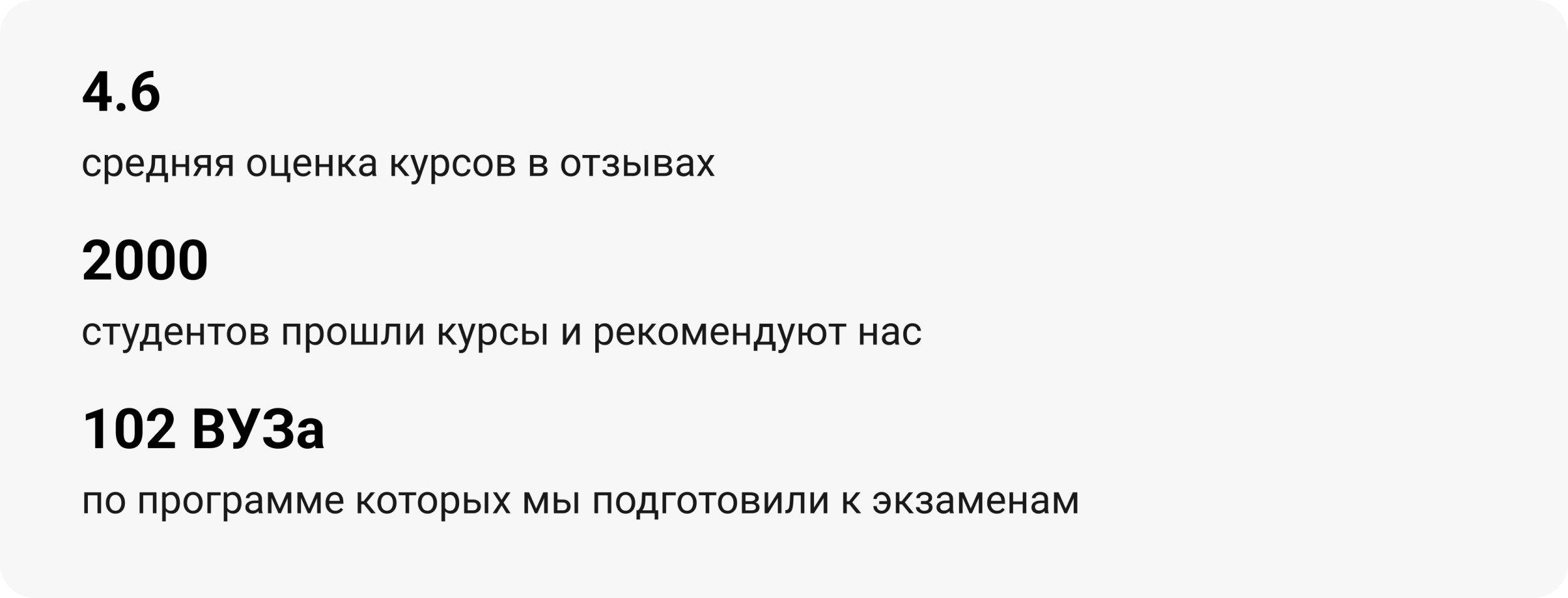 Мы адаптировали курсы под требования 100 вузов и продолжаем это делать — ежемесячно проверяем темы на соответствие программам и добавляем новые занятия, если этого просят студенты. Всё для того, чтобы ребята получали именно те знания, которые нужны для успешной сдачи экзаменов и уверенного понимания предмета.